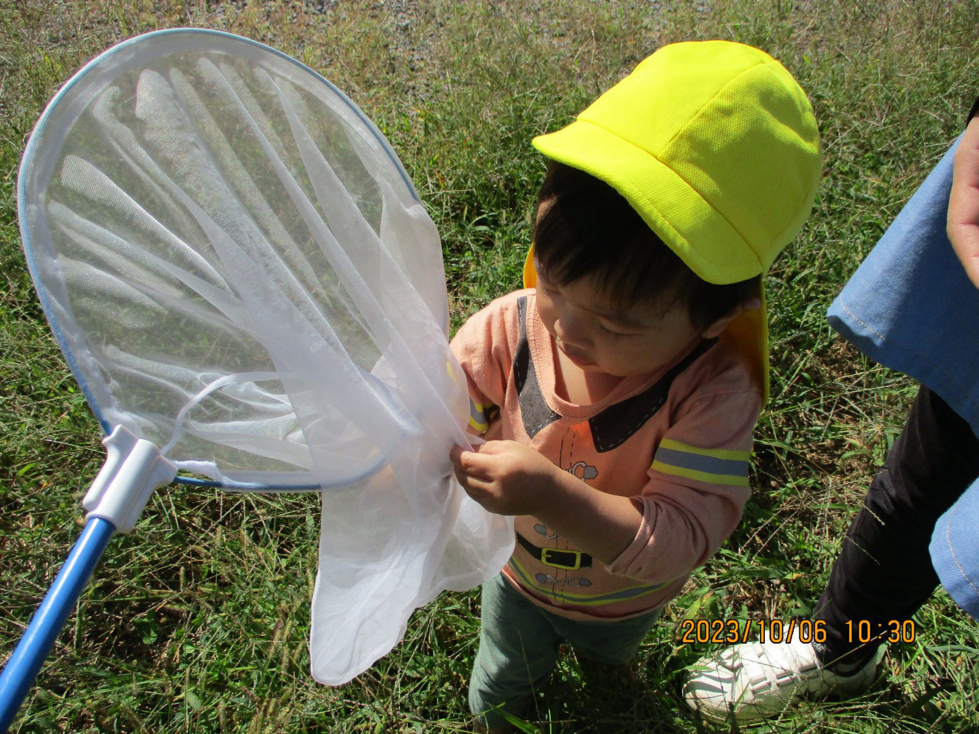 「どこどこ?」と虫網をのぞき込んでいます。