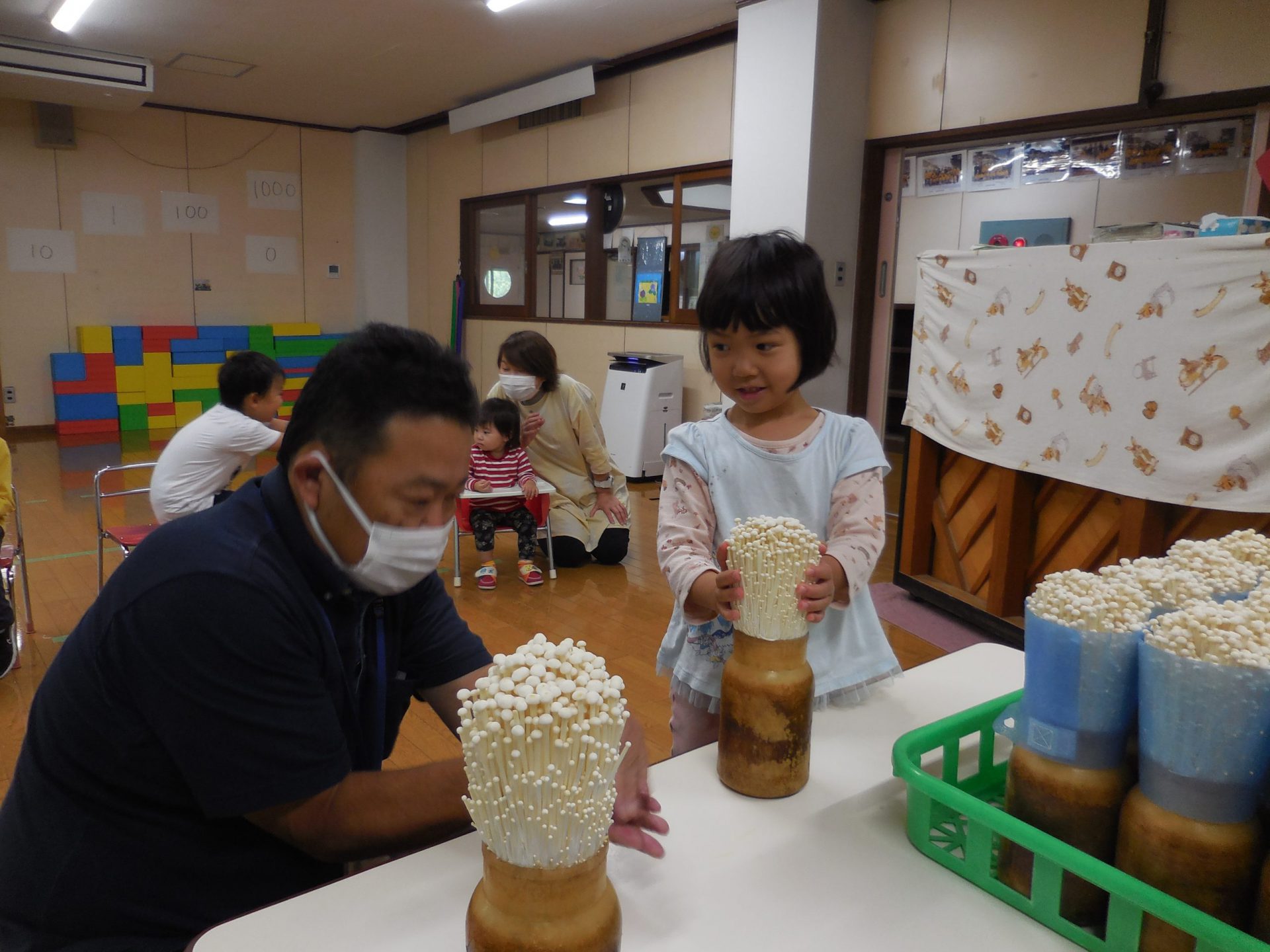 両手で持たないと持てないくらい大きなエノキタケの匂いを嗅いだり、感触を楽しんだり直接触れてわかる