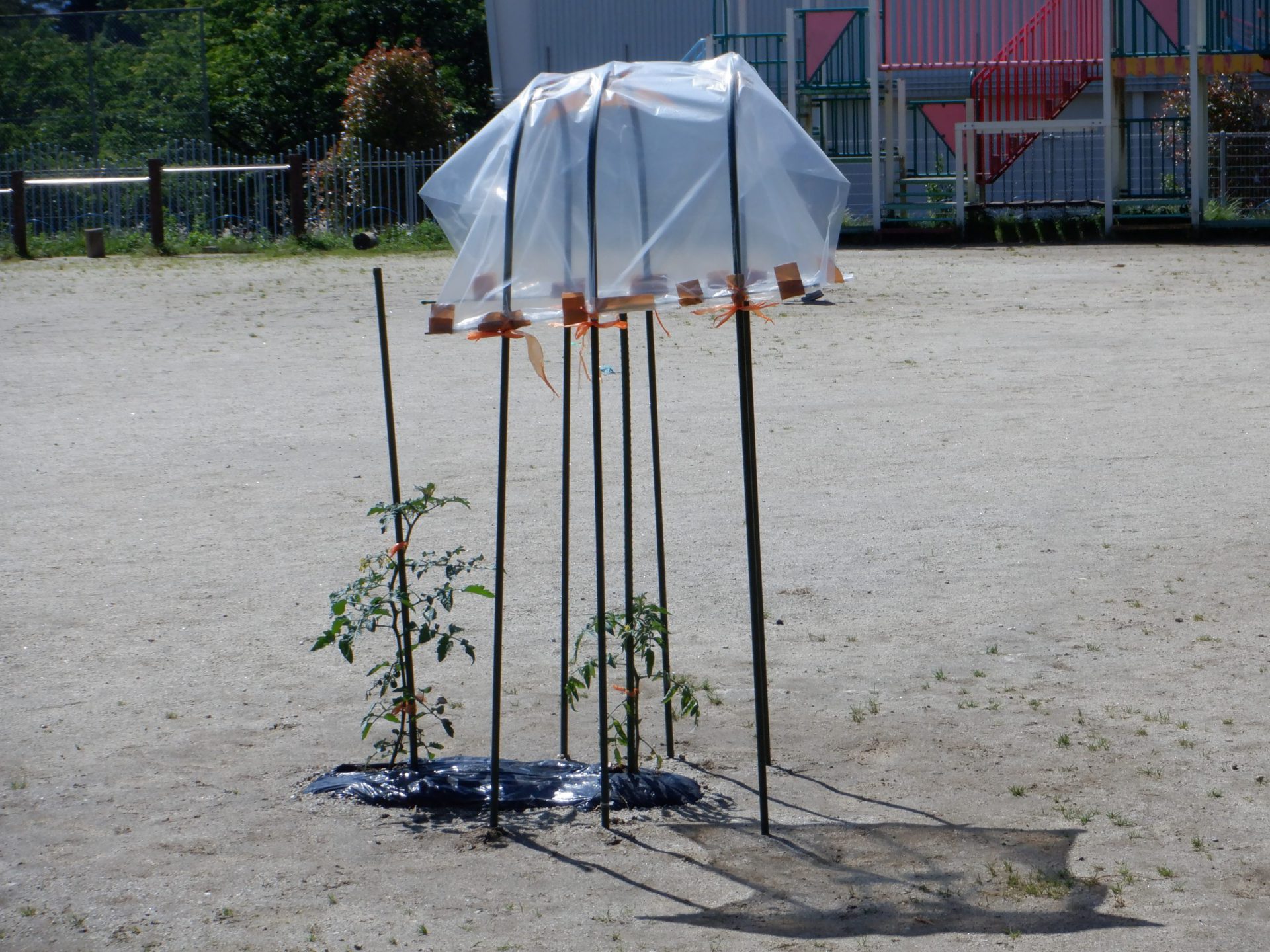 子どもたちが心配していたトマトの傘、保護者の方が農業用の曲がった棒を貸してくださり、