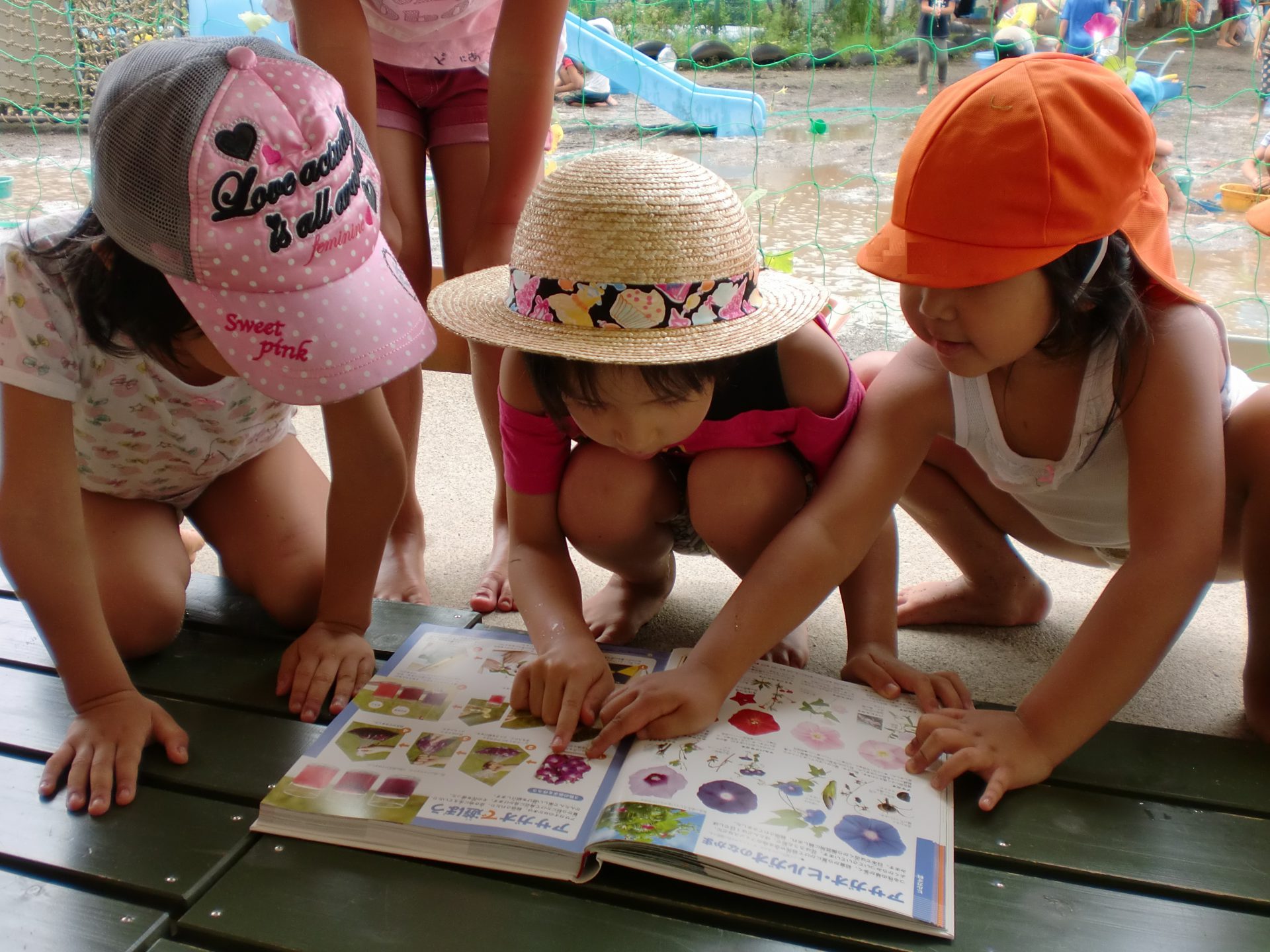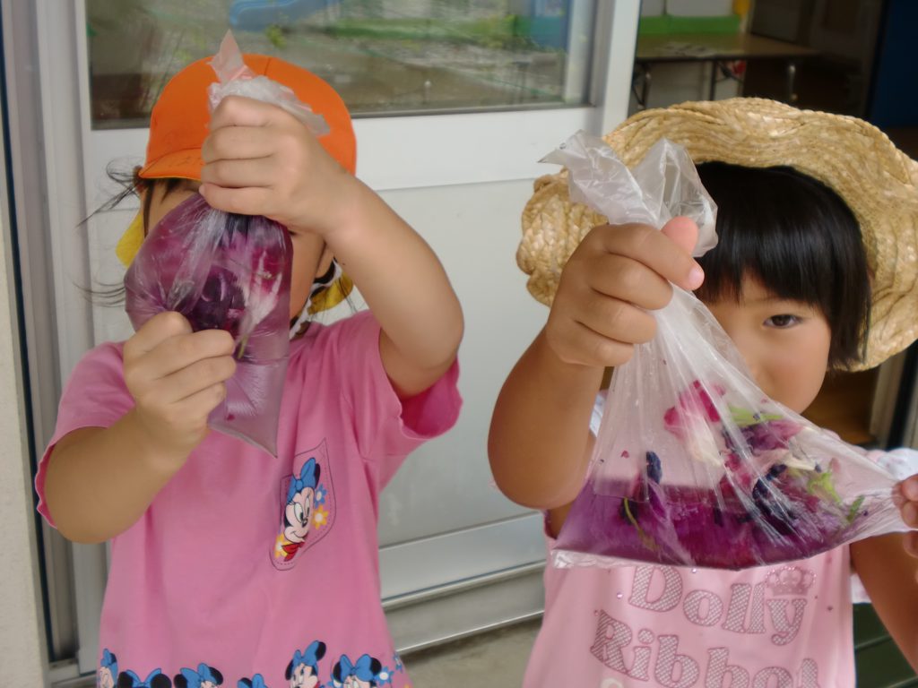 この色水作りは、5月に図鑑を見ていた子ども達が、あさがおで色水が作れることを知り、やってみたいというところから始まりました。