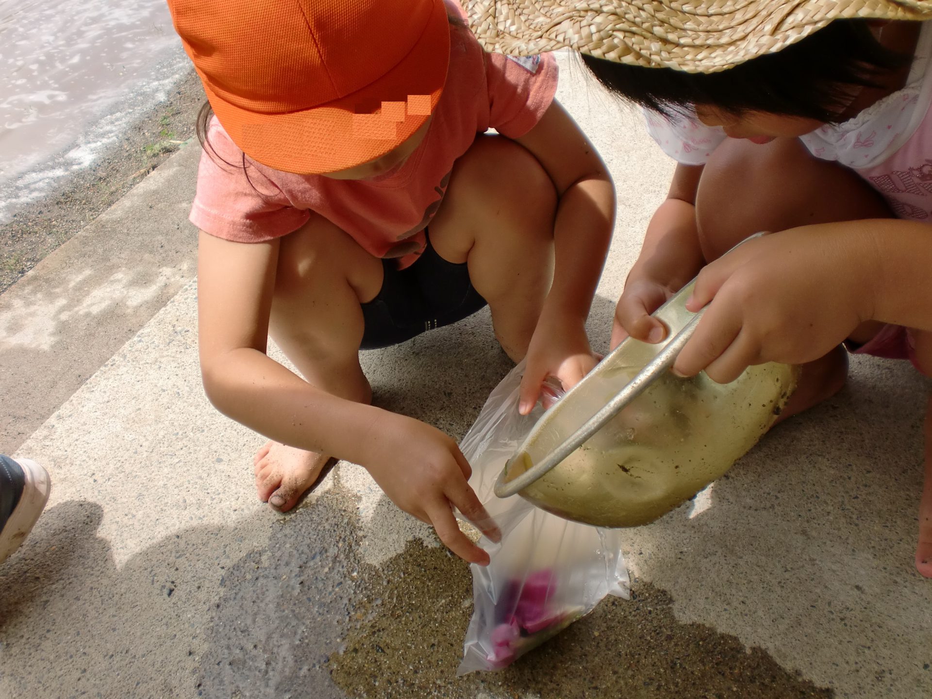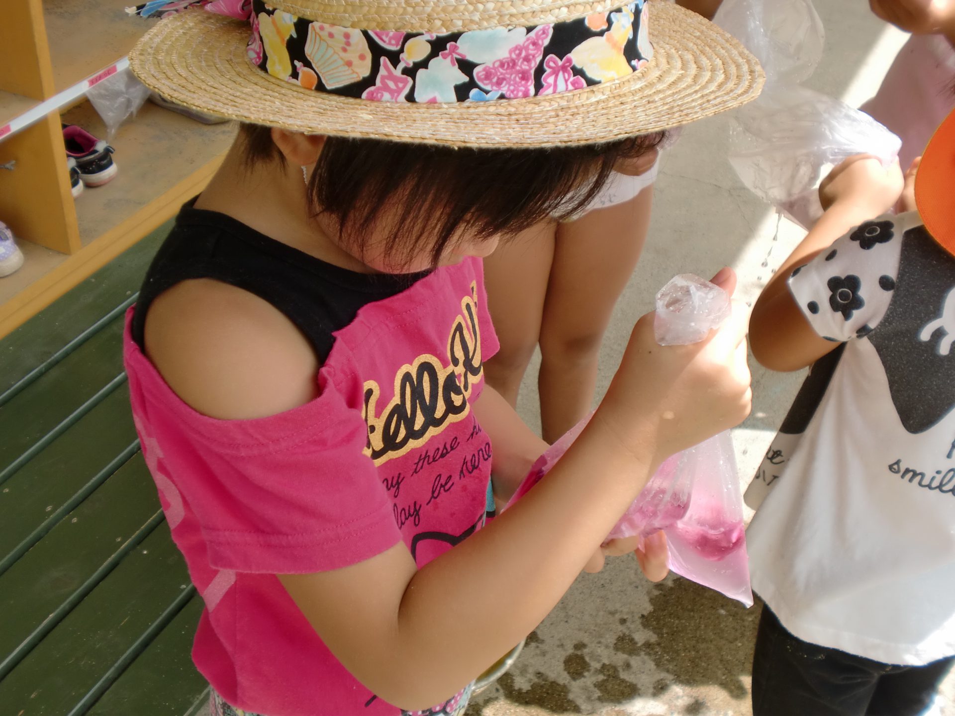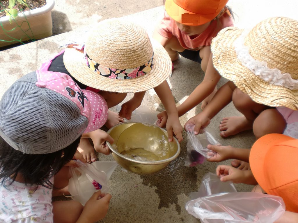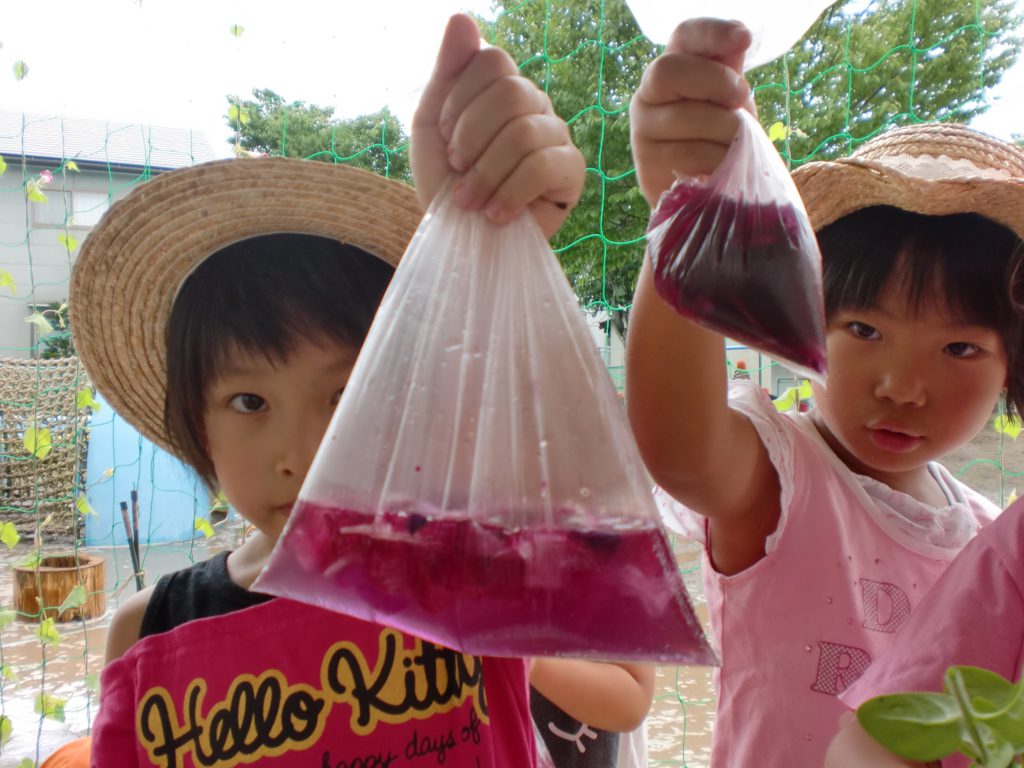 うまくいかない子には水の量を減らしたほうがいいんだよと教えてあげたり、もうちょっとあさがお増やしてみたらと友達同士でどうしたら綺麗な色水が作れるのかといろいろ考えている姿が見られました。