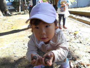 色々な大きさのどんぐりが見つかるのも楽しいようで、小さいどんぐりを見つけると「赤ちゃんみたいだね」と話していました。