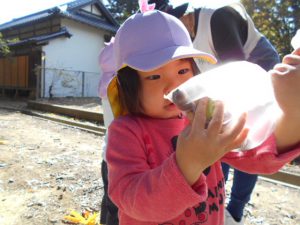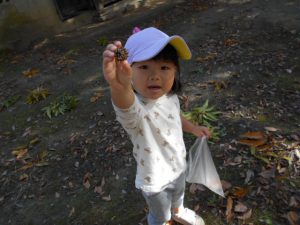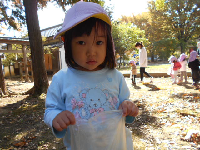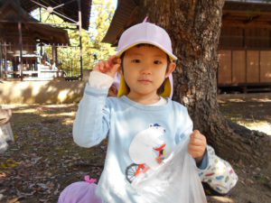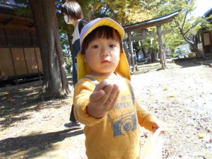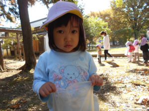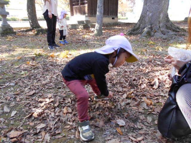 2歳児クラスで清水神社とホワイトリングに散歩に行きました。神社にはどんぐりがたくさん落ちています。