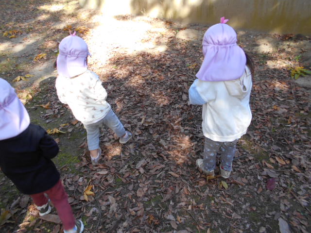 その季節にしかない物に興味をもってほしいと思い、たくさんどんぐりや葉っぱが落ちている場所に散歩に行きました。