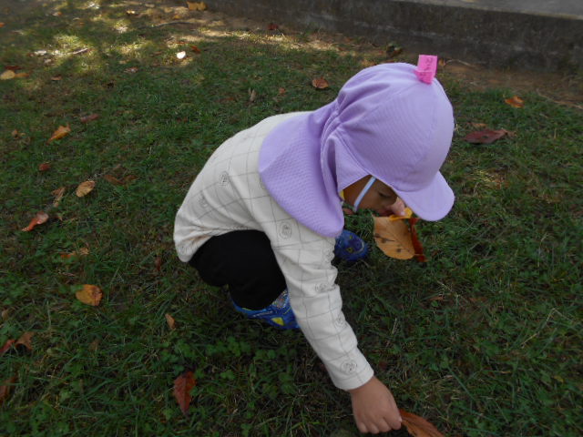 「葉っぱいっぱい!」と言いながらせっせと拾います。