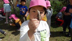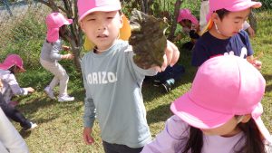 毎日色々な発見をする子どもたちは、落ち葉集めでもたくさんの発見をしていました。見た目、音、手触り・・・私たち保育士も子どもたちの気付きには驚くことがいっぱいです。些細な発見や気付きも友だちと共有しながらさらに関心を高めていってほしいなぁと思います。