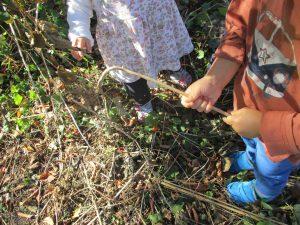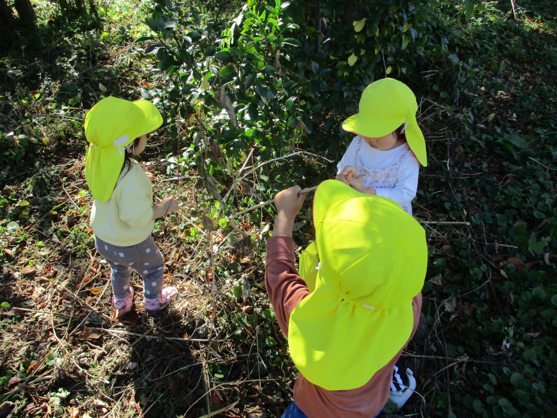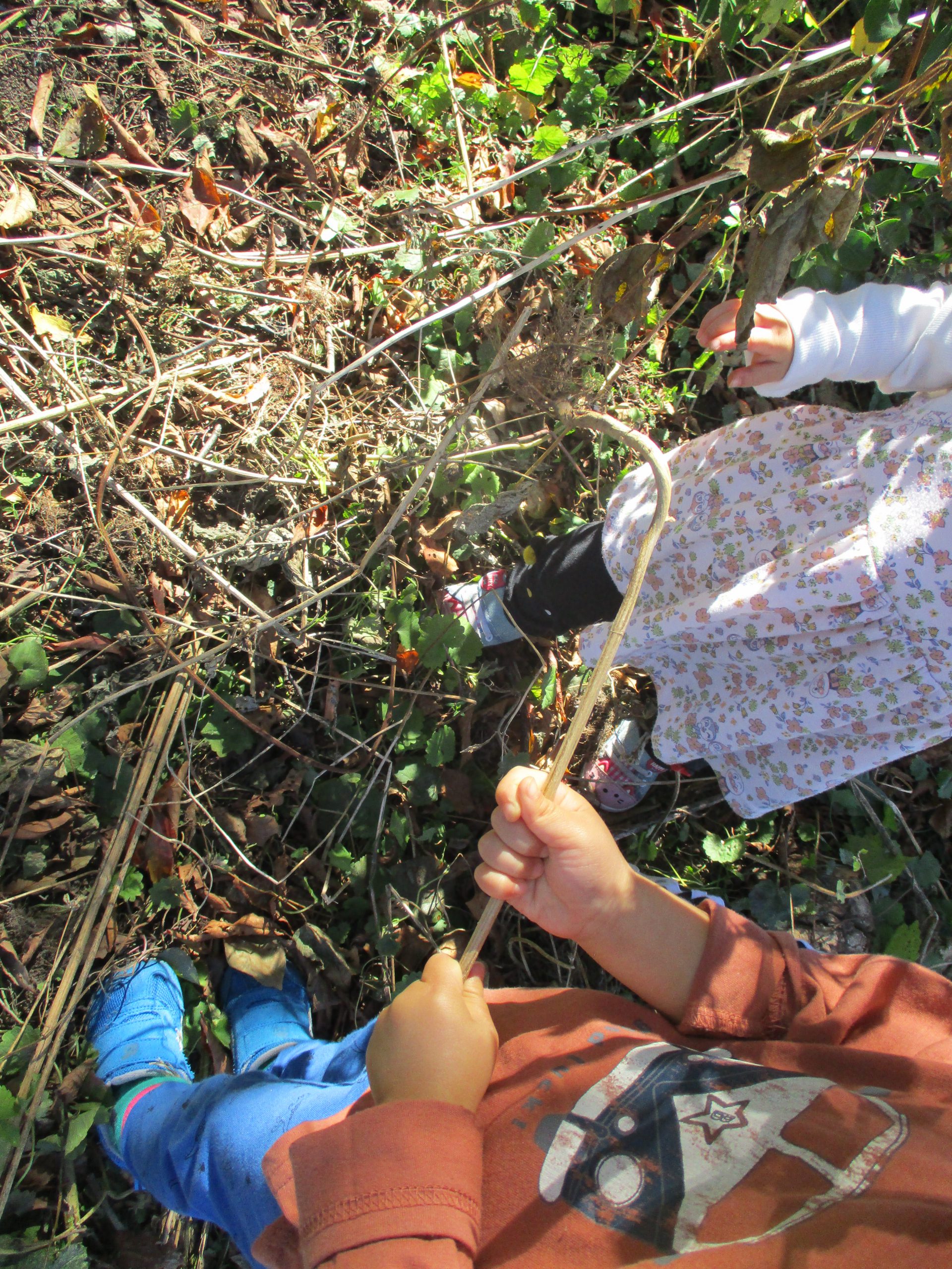 気になる枝を見つけてそれをとろうと引っ張りましたがなかなかとれず・・・。諦めずに引っ張り、最後は尻もちをつきながらも枝をとることができました。