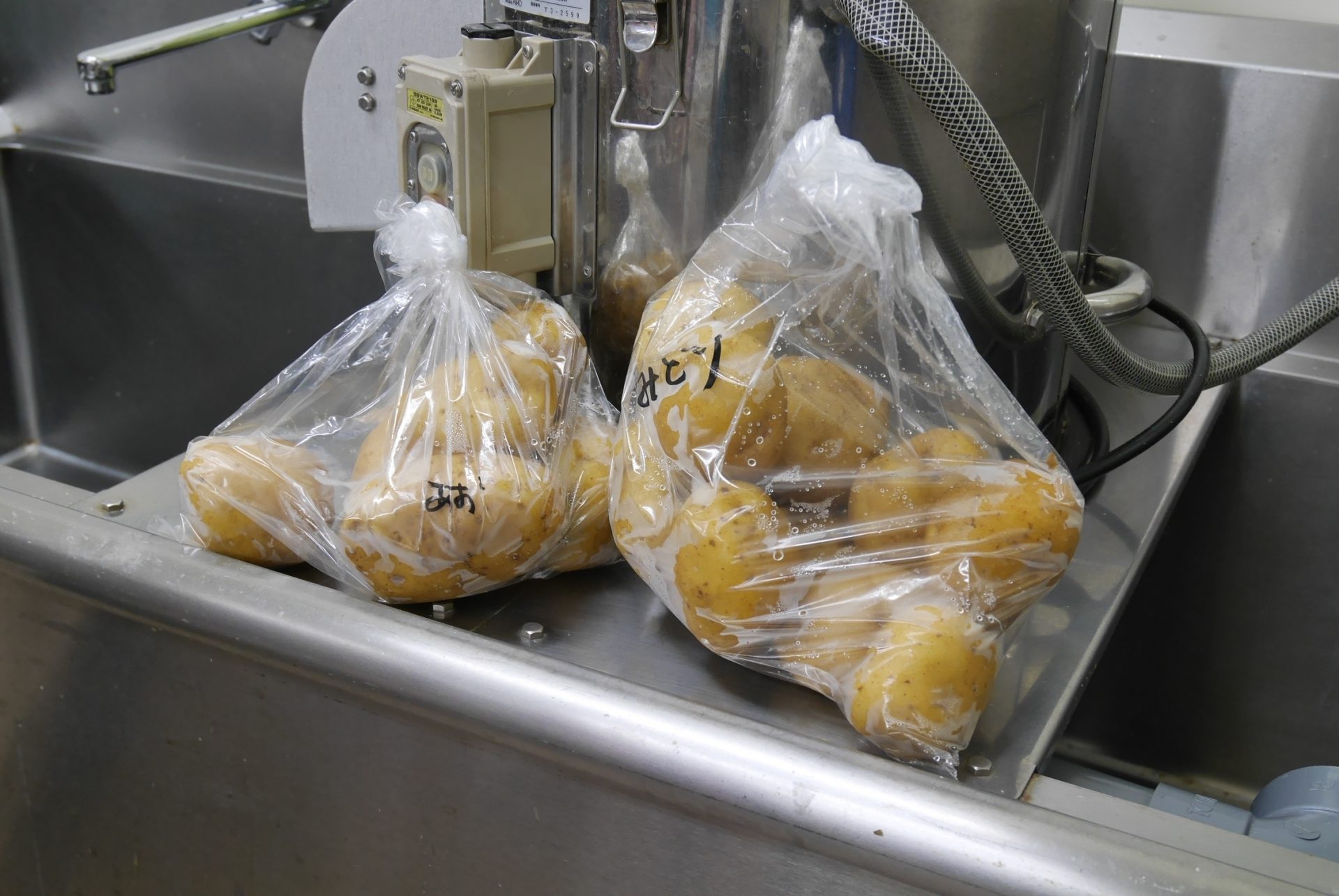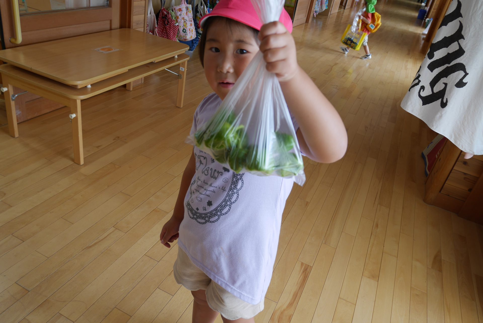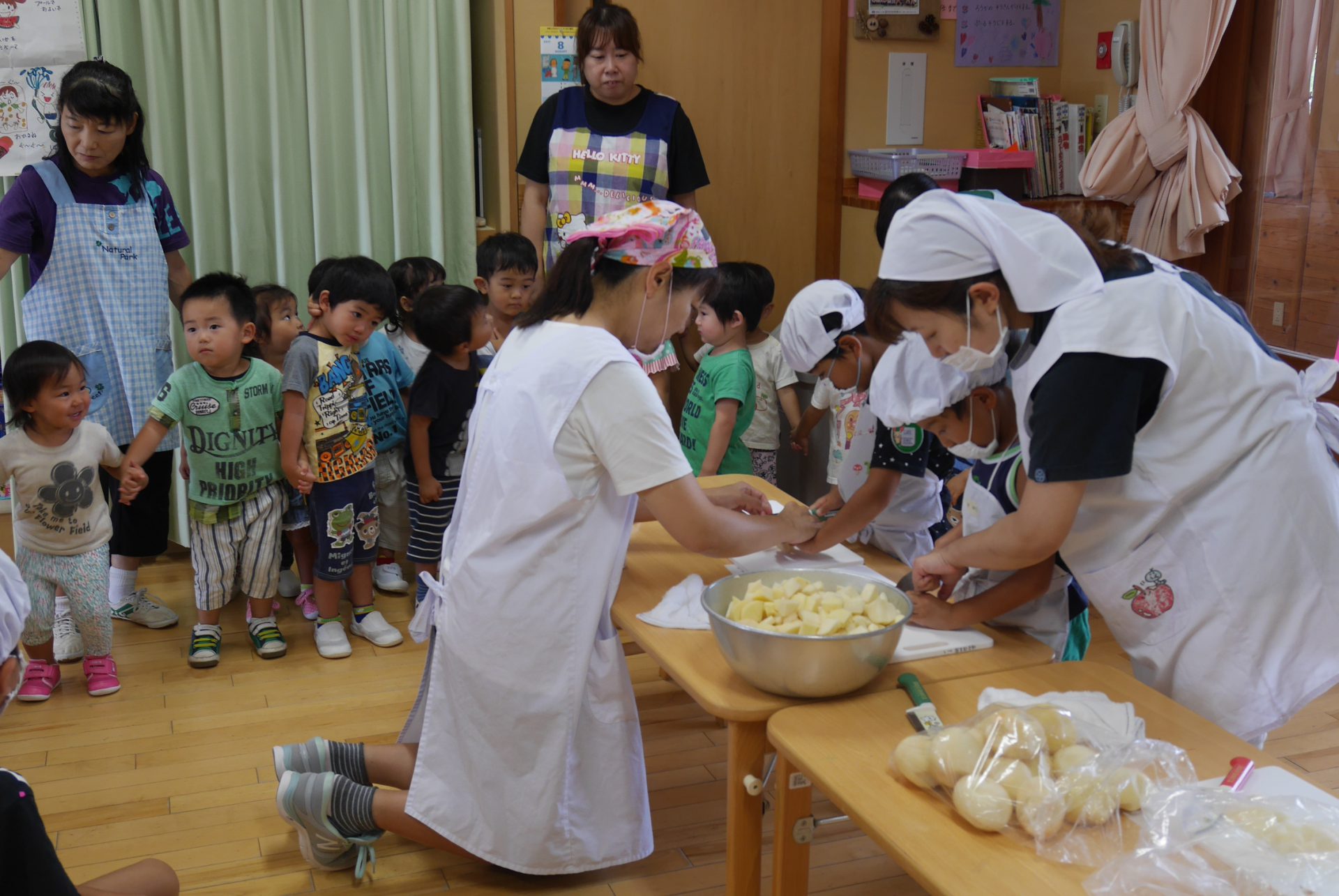 年長児が収穫したジャガイモがいよいよお料理されます。一旦給食室へ。「いってらっしゃーい」