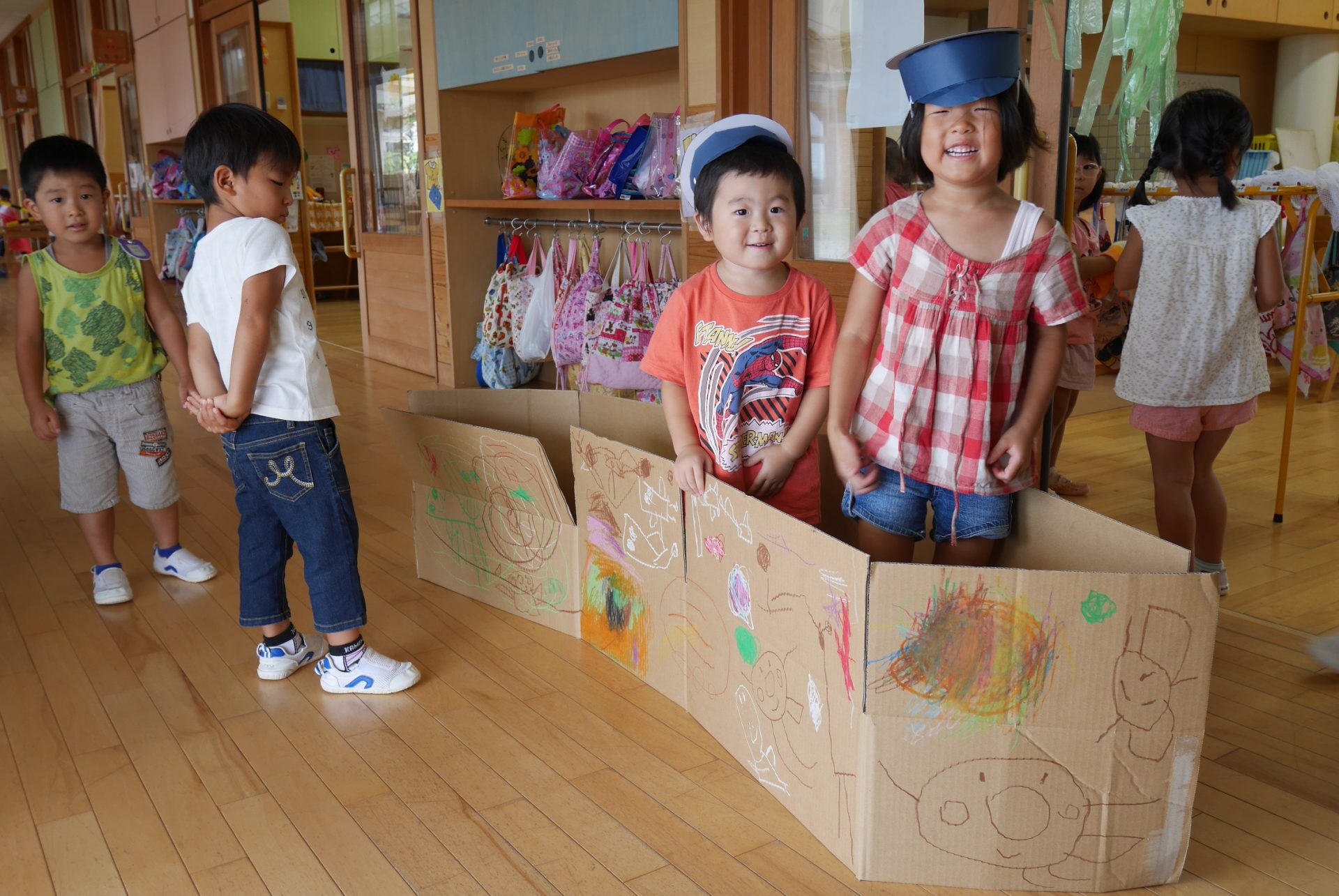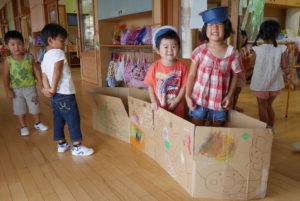 来ました。「年長さん上手だね。」 「待っている間に電車ごっこしているよ!」
