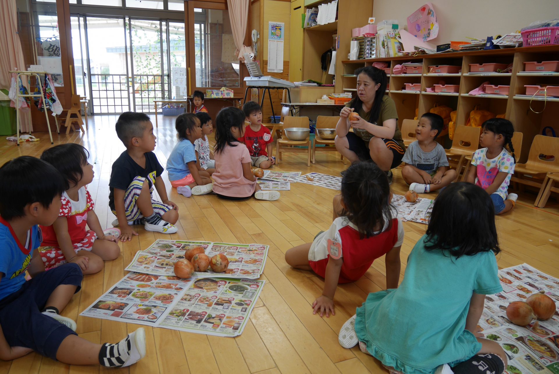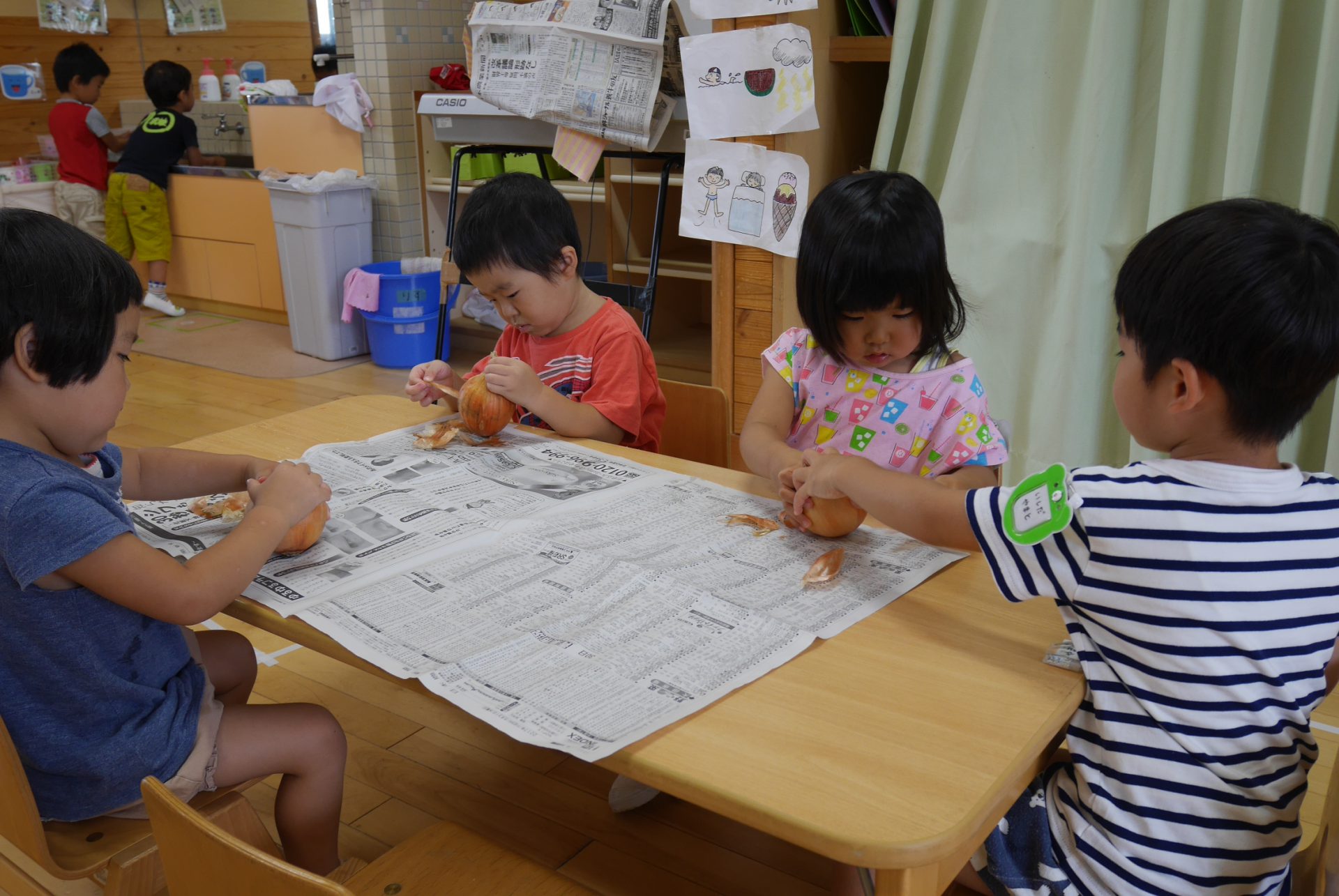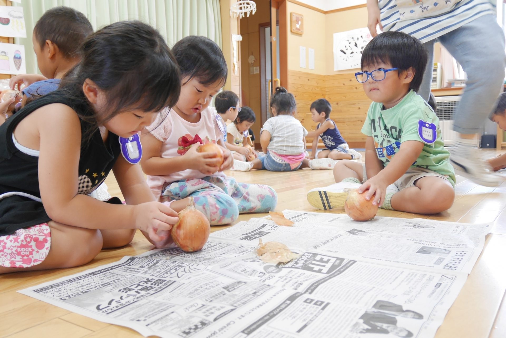 年少さんは玉ねぎ皮むきのお手伝いをしました。みんな真剣そのもの。かわいい指で