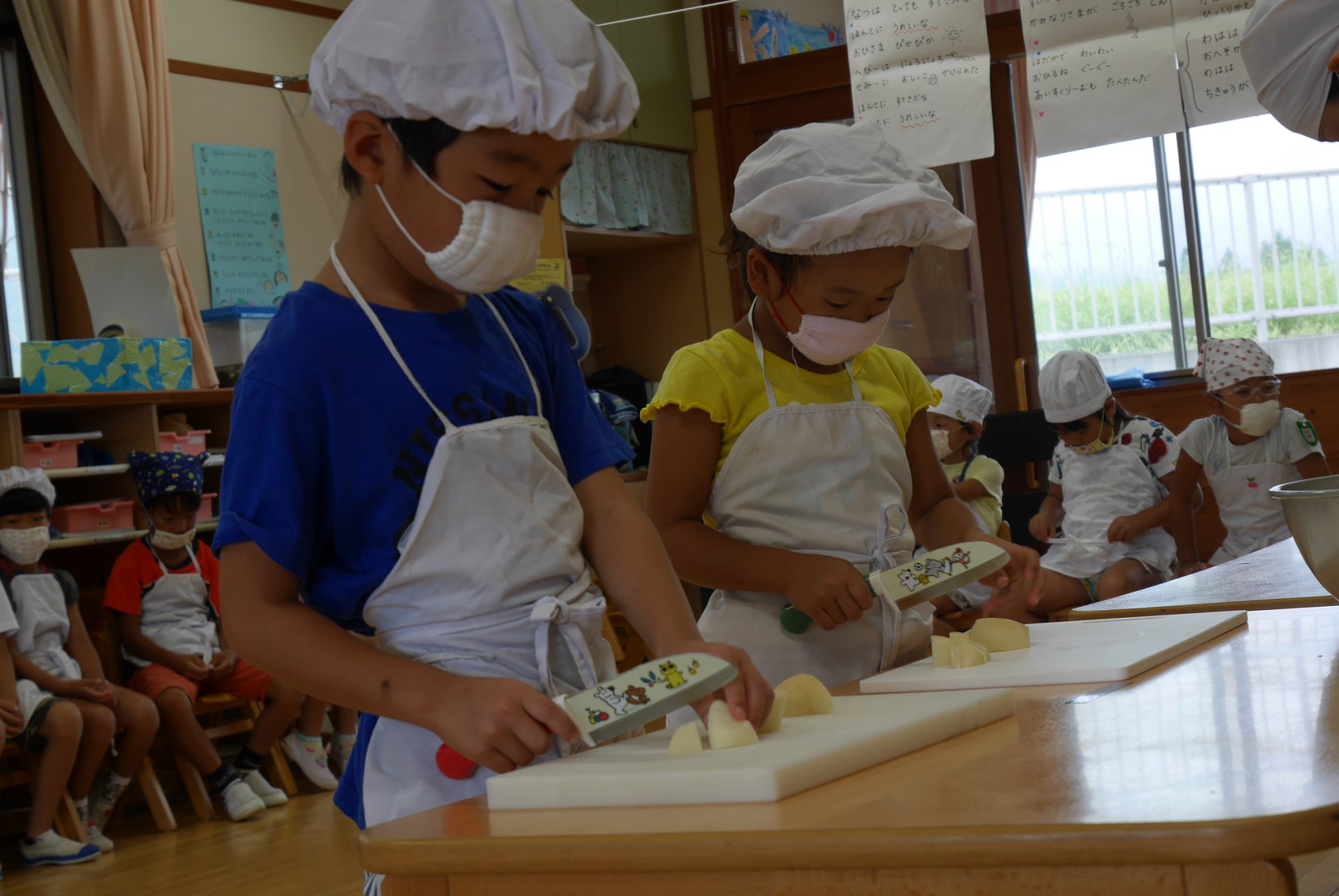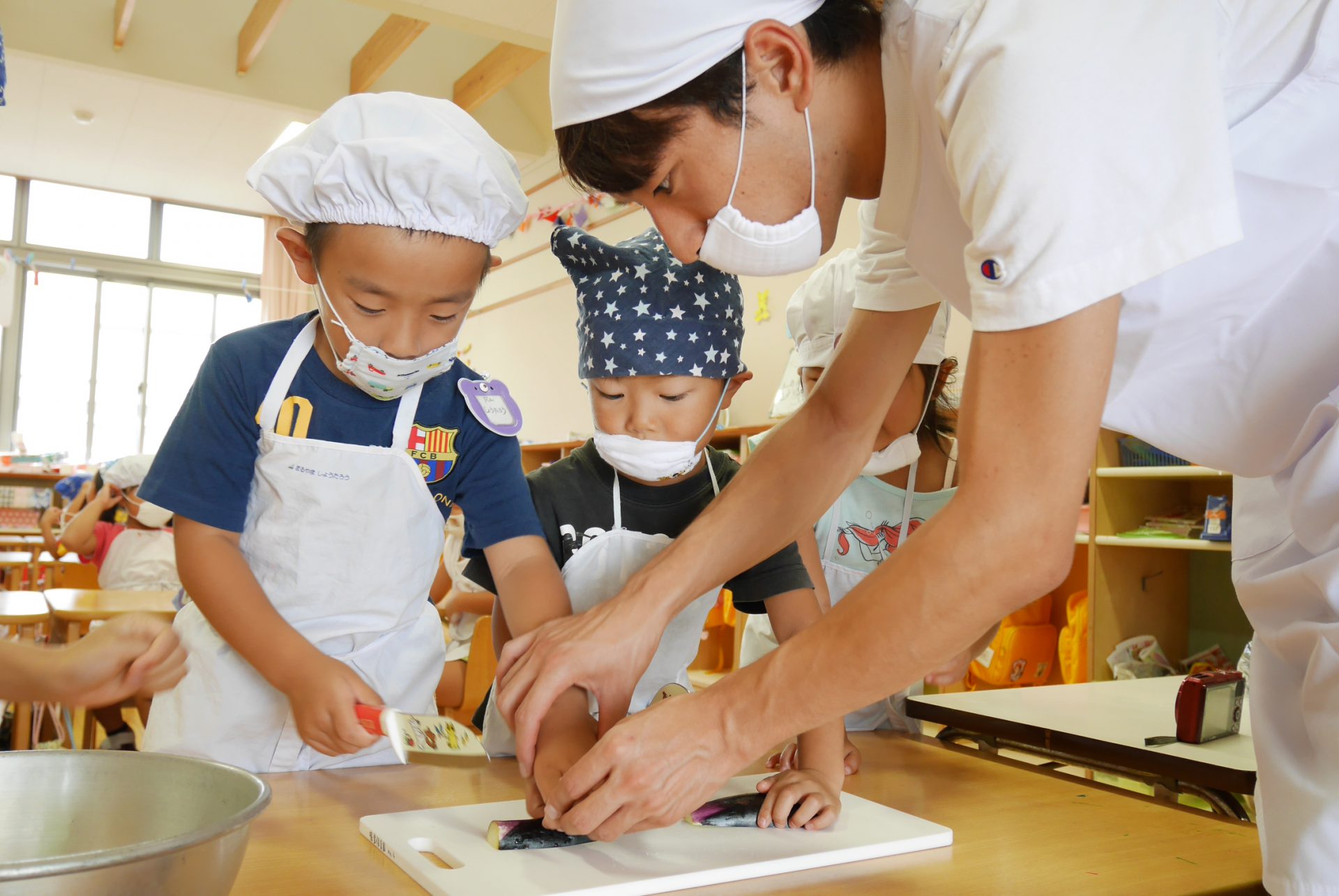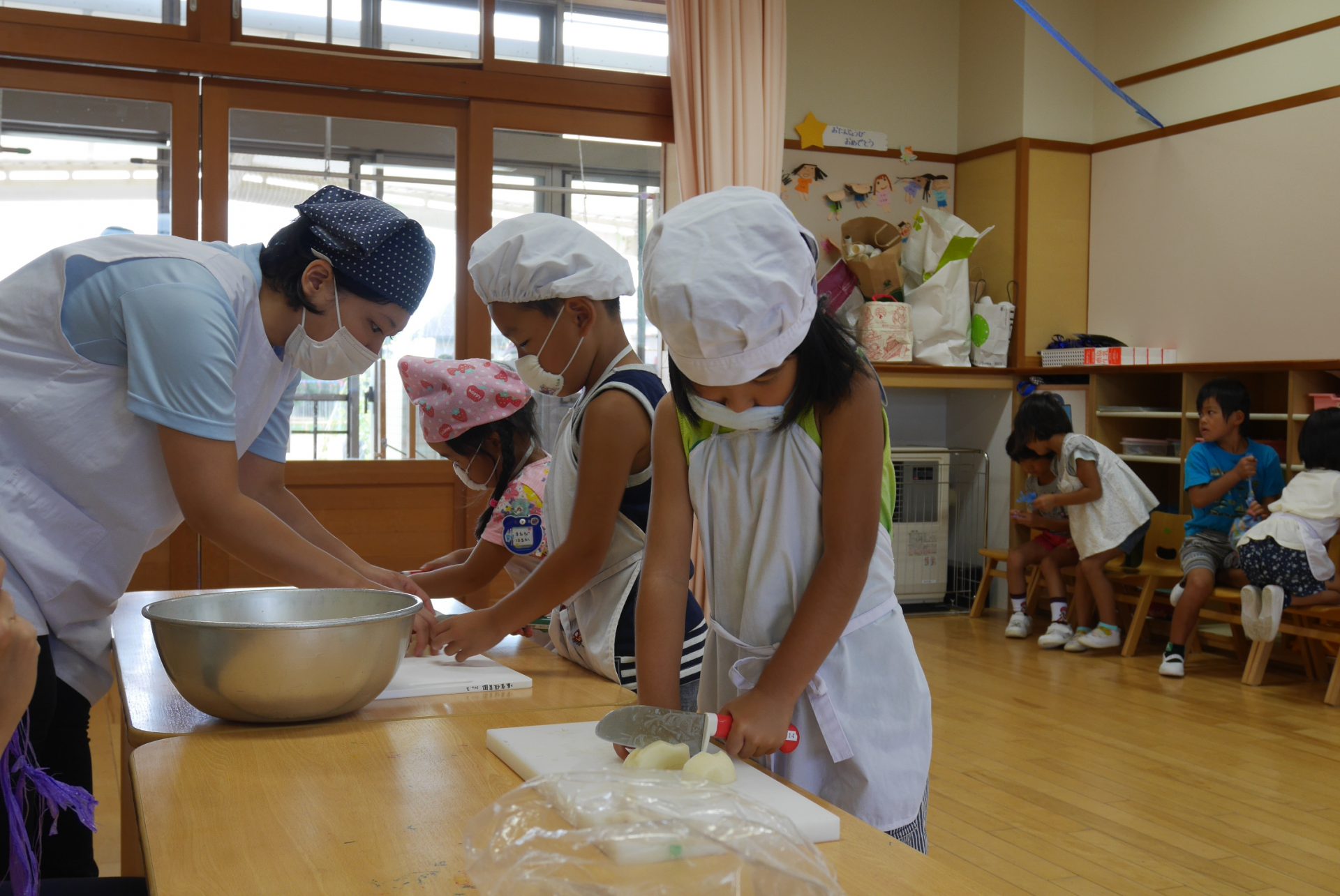 「ここをしっかりおさえてね。」「上手に切れるかな、手は切らないようにね」