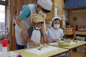 クッキングでは家庭で練習してきた子や日常、家での経験がある子どもたちは包丁を使うことや手さばきが上手だと感じました。何事も経験することで方法を獲得することがわかりました。畑作りができる自然に恵まれた環境にいることの有難さを改めて感じることができました。
