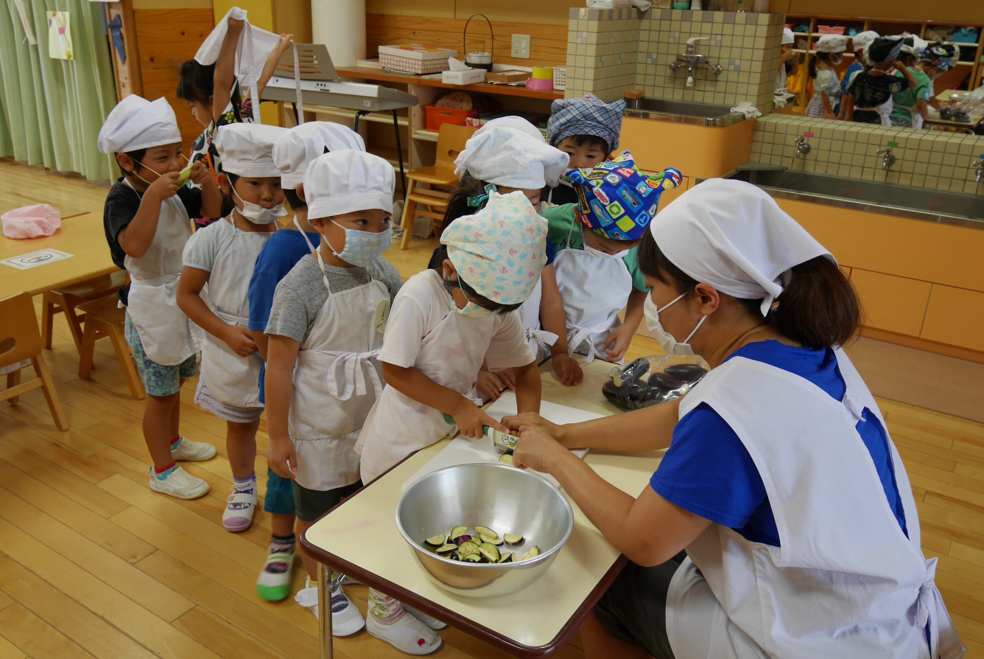 今年はナスもたくさん収穫をしました。包丁とまな板を使ってナス切りに挑戦です。