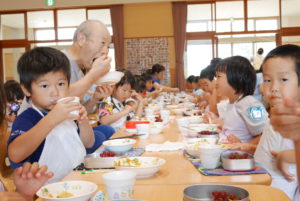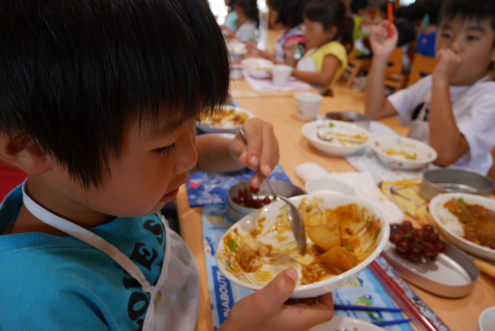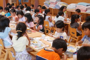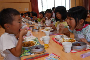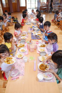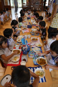 「(僕が切った)ナスがないよ」と探している子、一口では食べられないほど大きいジャガイモ・・・自分たちで育てた野菜をクッキングしたことで、どの学年も喜んで食べ、苦手さのある子も完食をしました。また、場所など環境を変えることでより一層楽しく、美味しくカレーを頂くことができました。