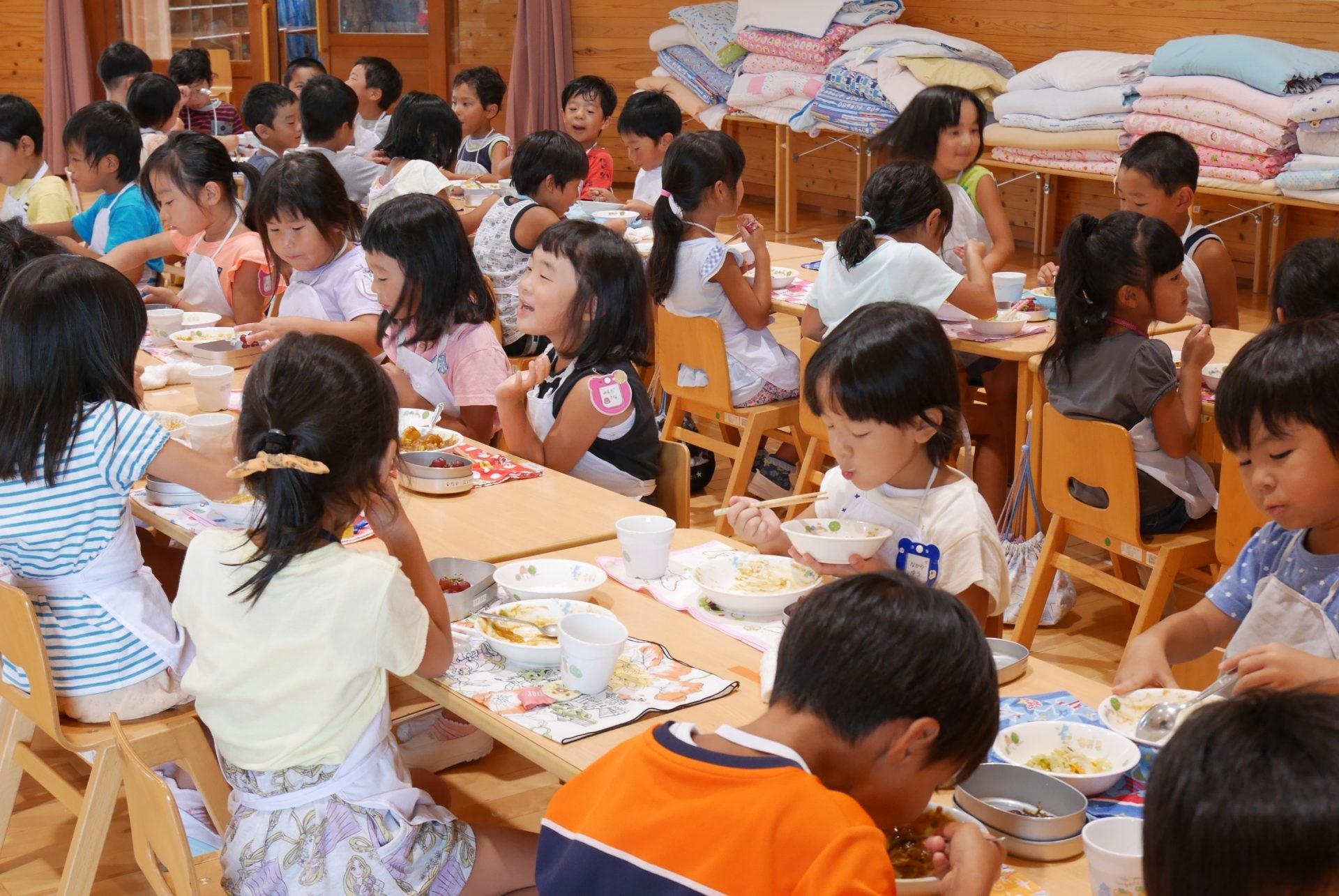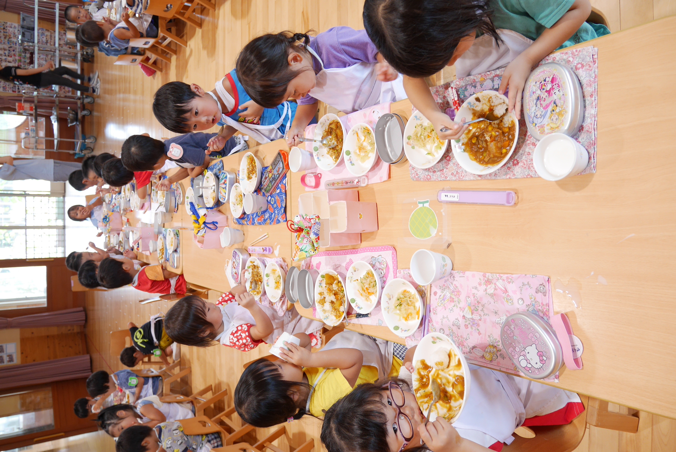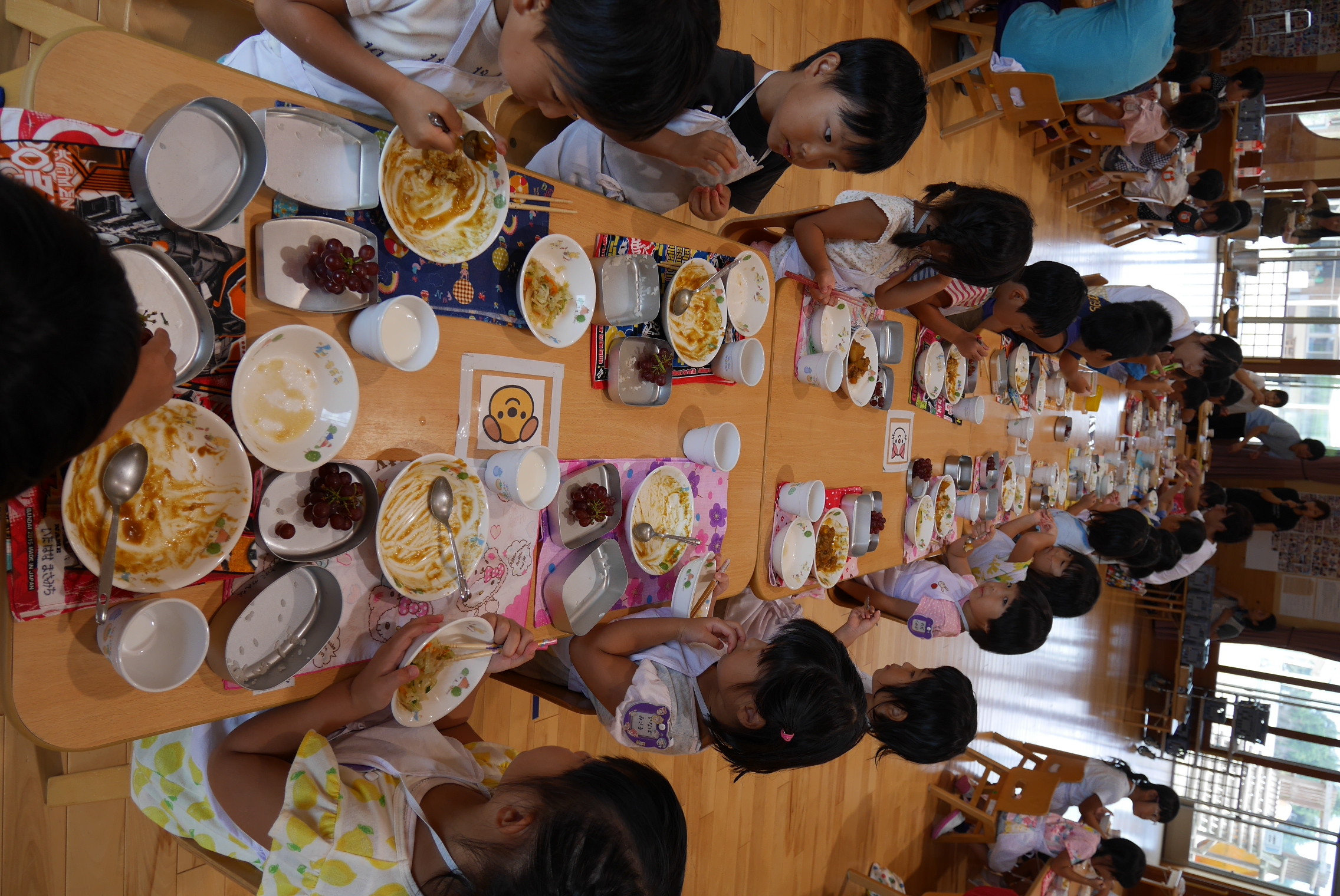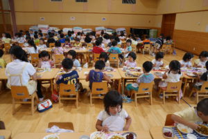 年少・年中・年長さんが遊戯室に机を並べて大きなレストランが出来上がりましたよ。