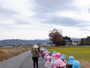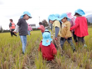 地域の方のご厚意により、落ち葉を拾って集めたり、広い田んぼの中で自由にあそぶという貴重な体験もさせてもらったりした子どもたちです。