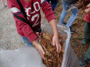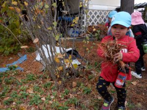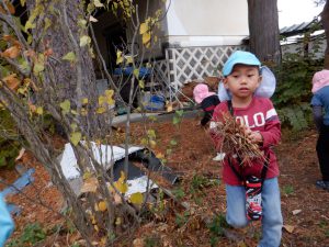 「焼きいもにしよう!」「おいもを焼くには木がいるね」「落ち葉もいるね」と考えた子どもたち。