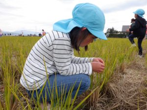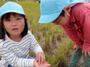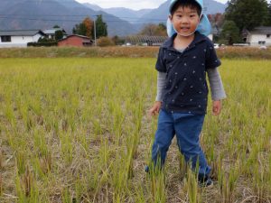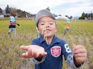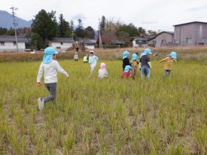 落ち葉拾いのあとには広い田んぼで遊ばせてもらい、思いきり走ったり落ち穂拾いをしたり、楽しい経験ができました。