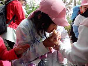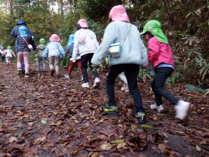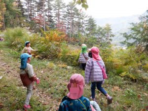 「葉っぱがぬれてるから滑るよ。気をつけて」先に登っている友だちから声がかかります