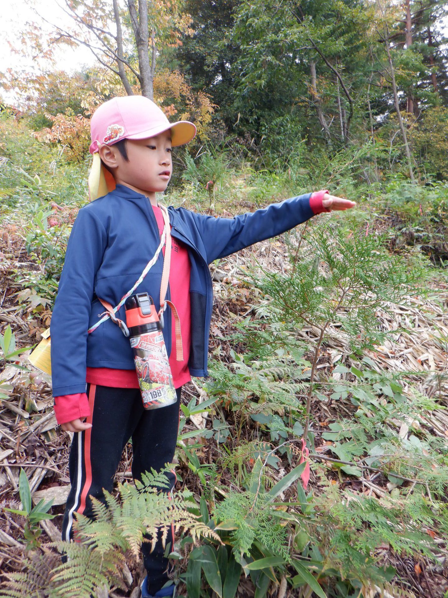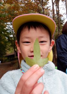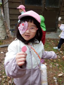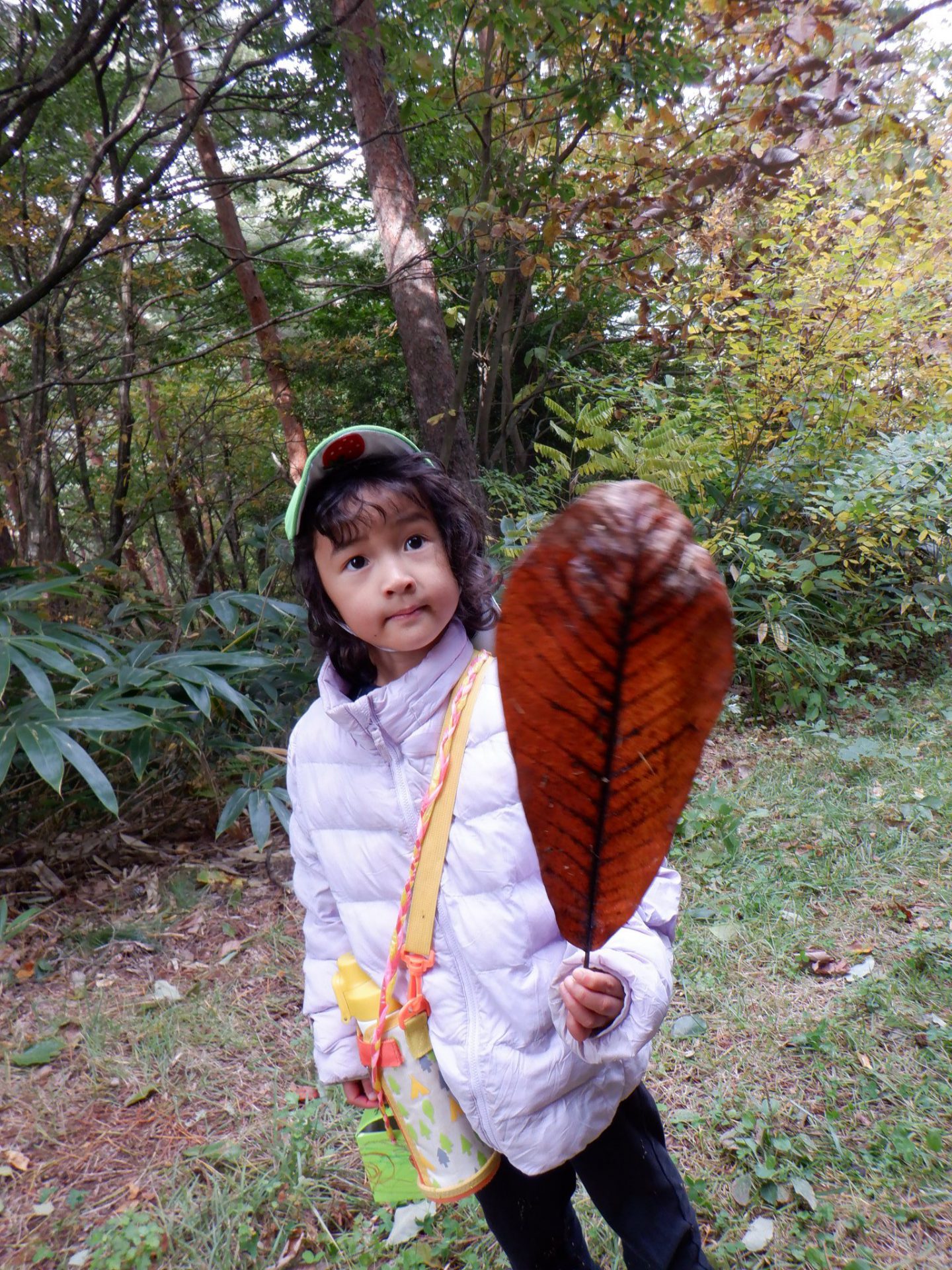 「ピンクの葉っぱ見つけた!きれいでしょ」
