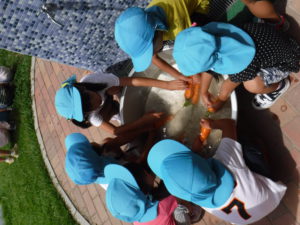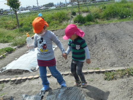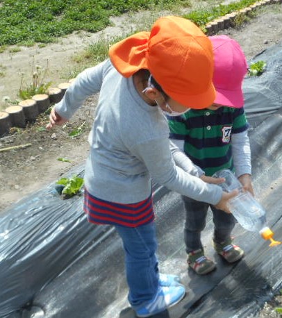 種まきの時、ペットボトルジョーロで水やりをする年長児の姿をじっと見ていた年少児に「お水あげたいの?」と聞き、「こっちにおいで」と一緒に水やりをさせてあげていました。
