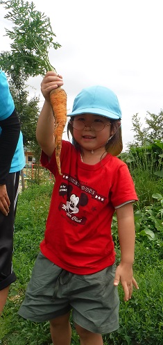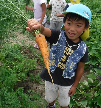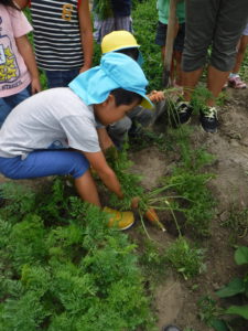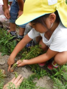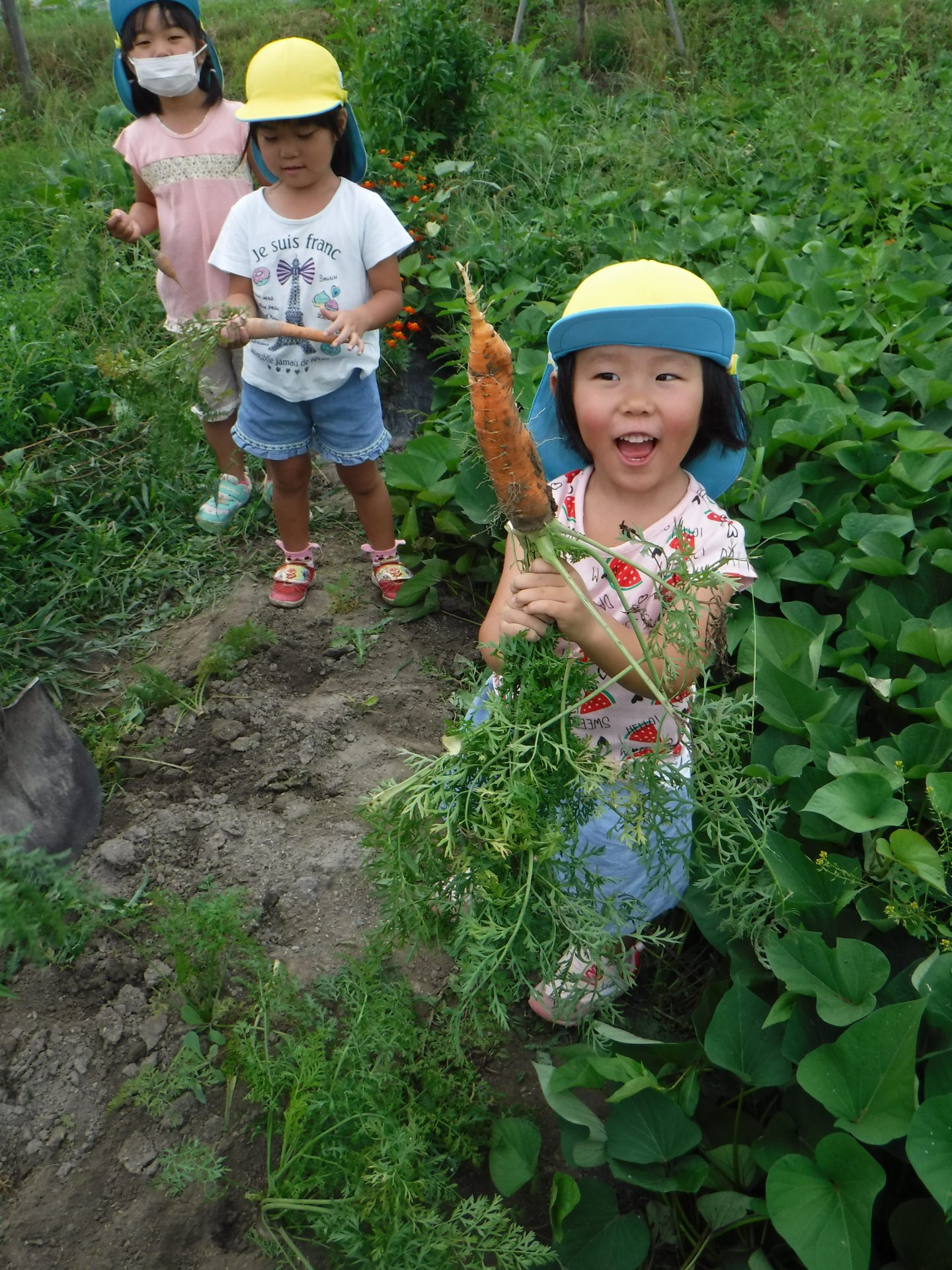 ・年中児のニンジンは昨年(年少児の時)ペットボトルに種まきをして育てましたが大きくならず、今年は大きなものを収穫させてあげたいと思い、畑に直播しました。とても立派なものができ、笑顔で収穫できて良かったです。また、成長過程では、初めてニンジンの葉っぱを見た子がいたり、青虫を見つけて育てたり、様々な体験ができました。