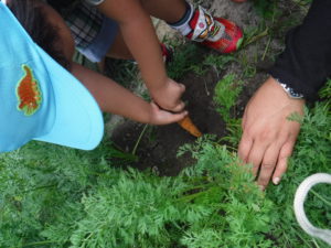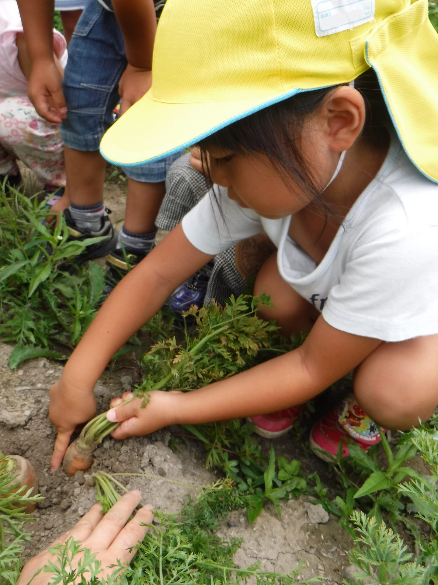 そして、「おおきいのがとれたー!」「白いのもある」においをかぎ、「ニンジンのにおいがする!」と喜んでいました。