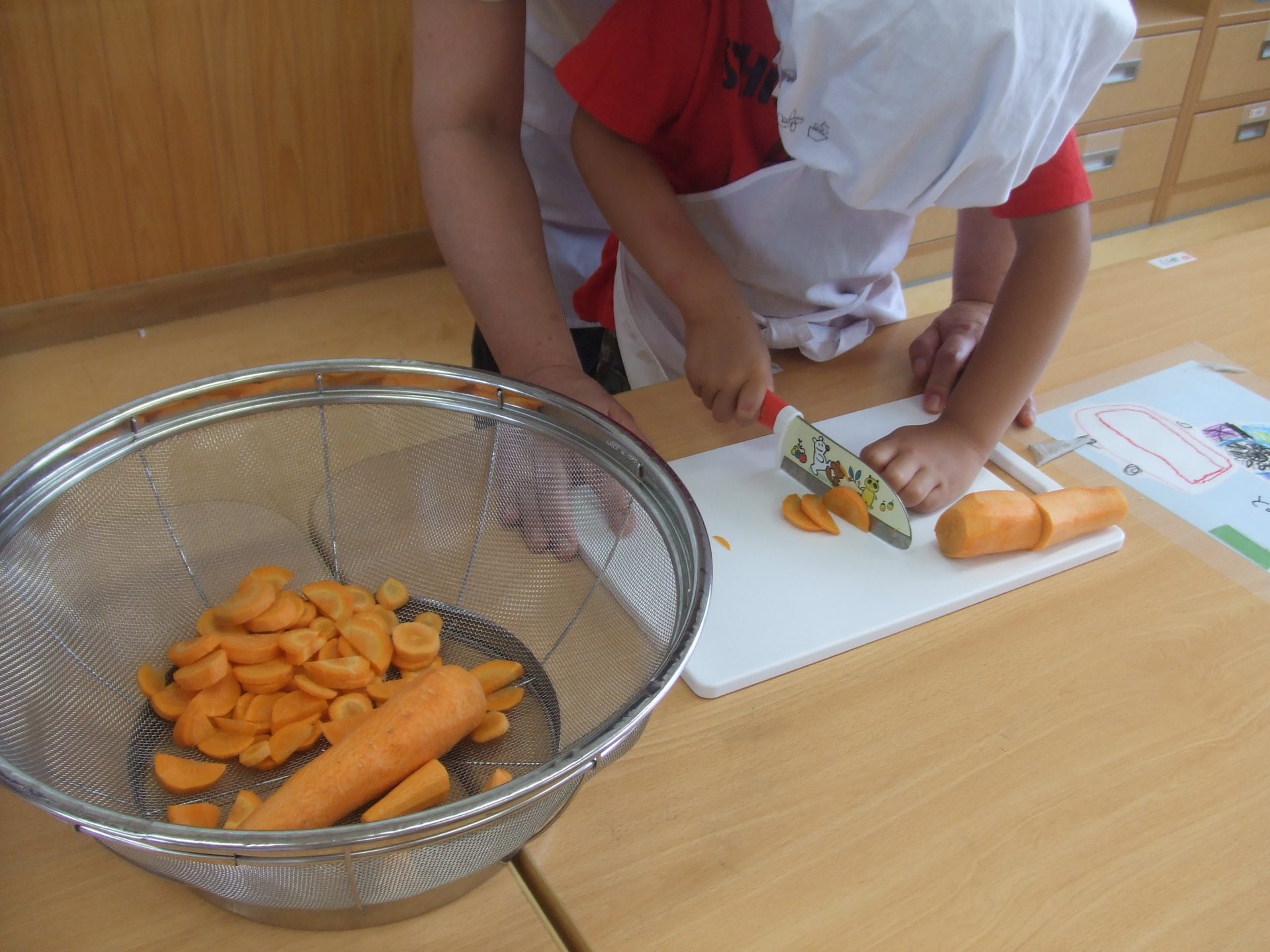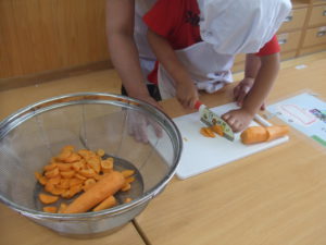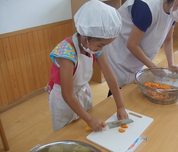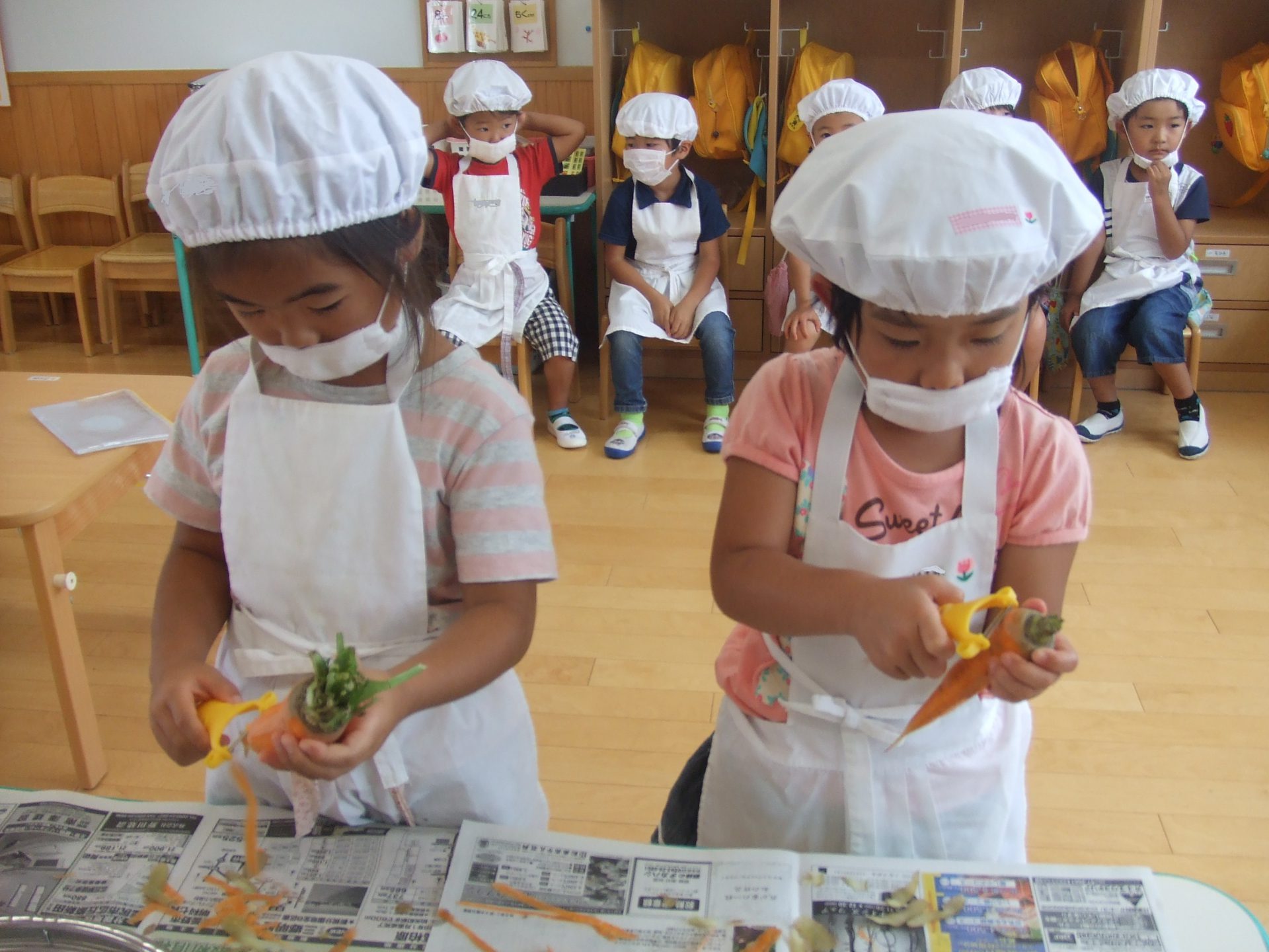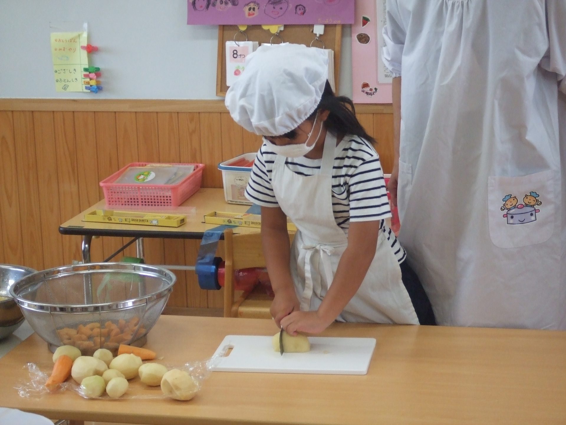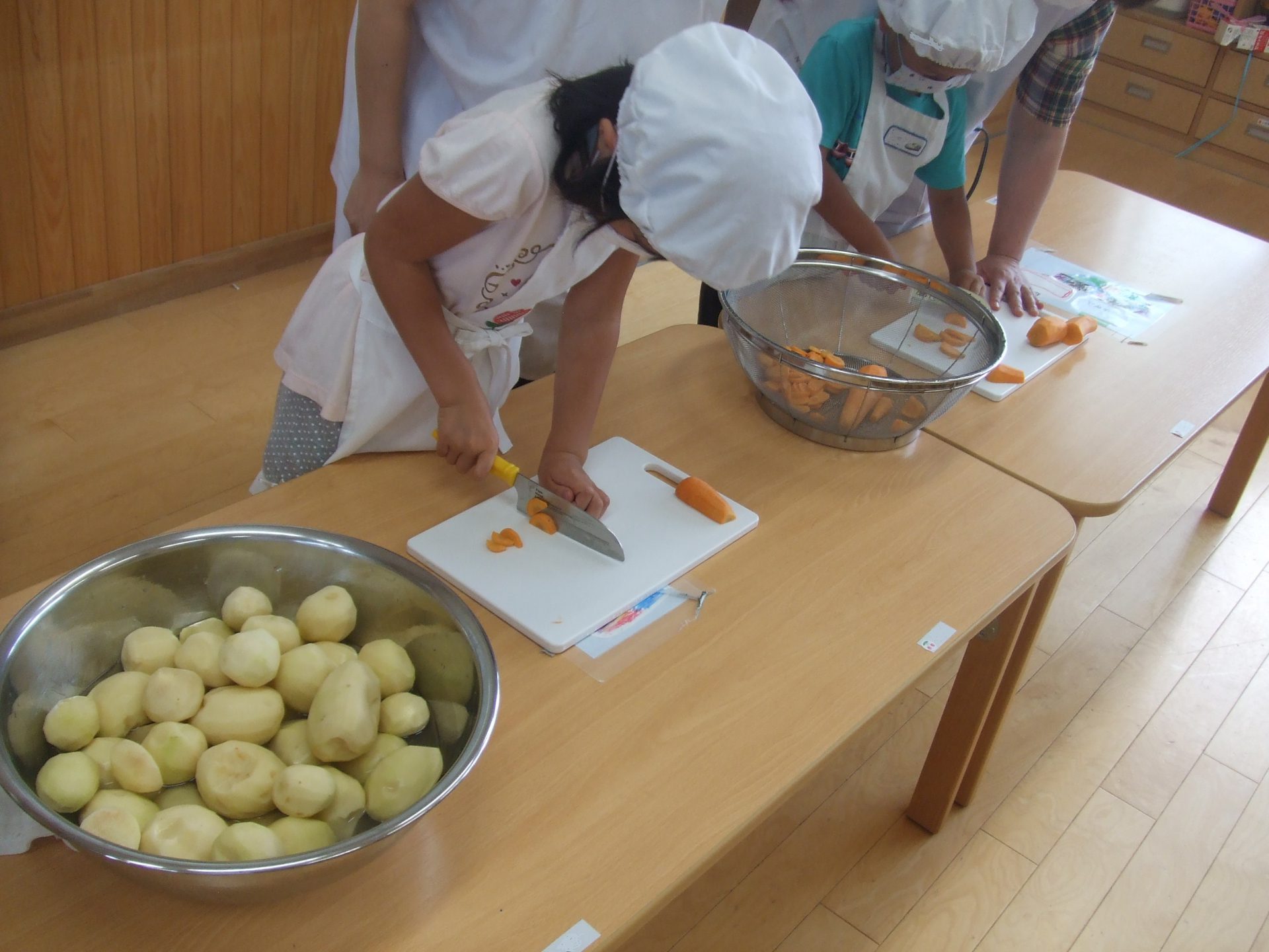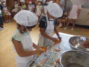 クッキングの時、年少児は皮むきや包丁を使っているお兄ちゃん、お姉ちゃんの姿を憧れの眼差しで見ていました。