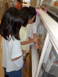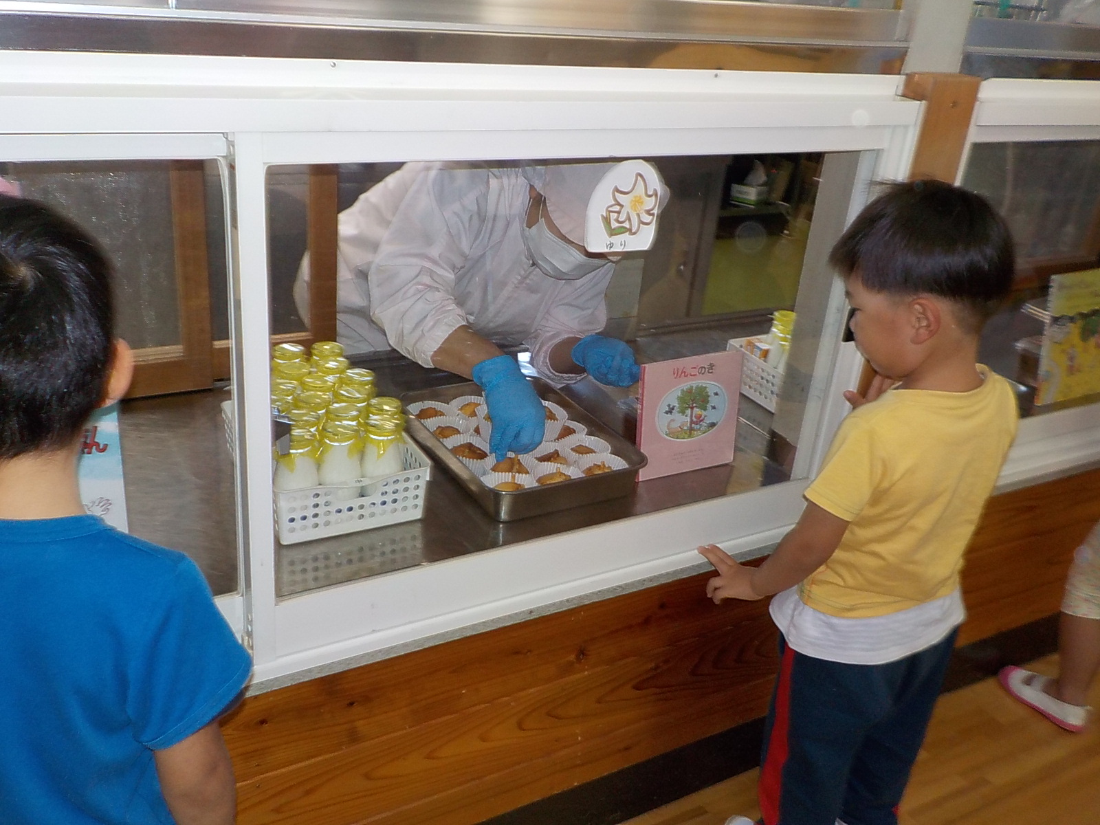 午睡から目覚めた子どもたちは甘い香りに誘われて給食室の前に・・・給食先生が最後の仕上げをしている様子をジッと見ていました。