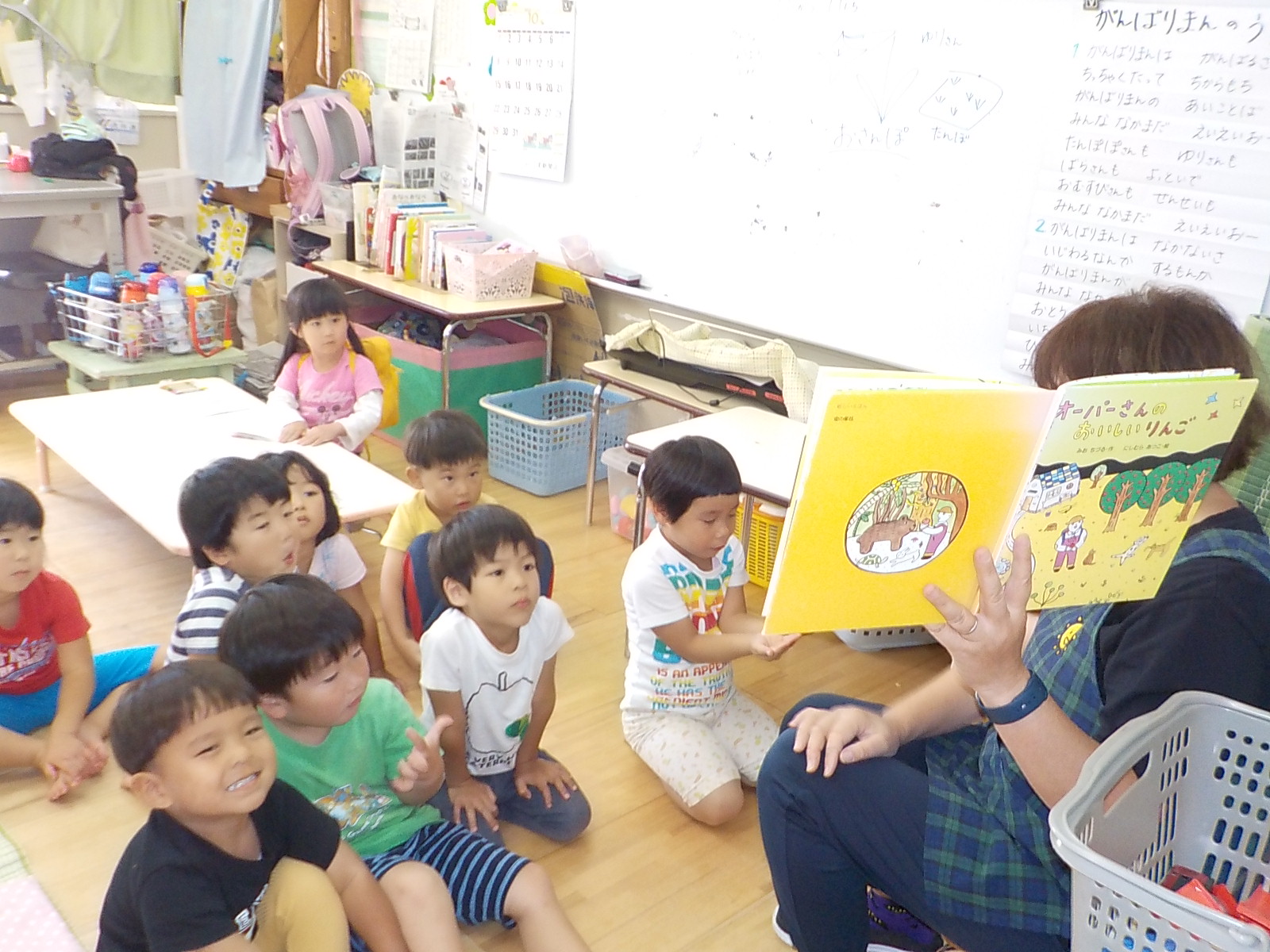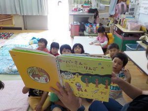 年少さんは「りんご赤いね。」とジッと保育士の読み聞かせに耳を傾かながら見ていました。
