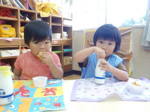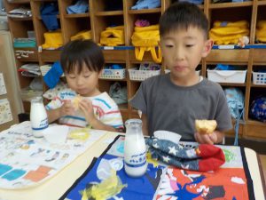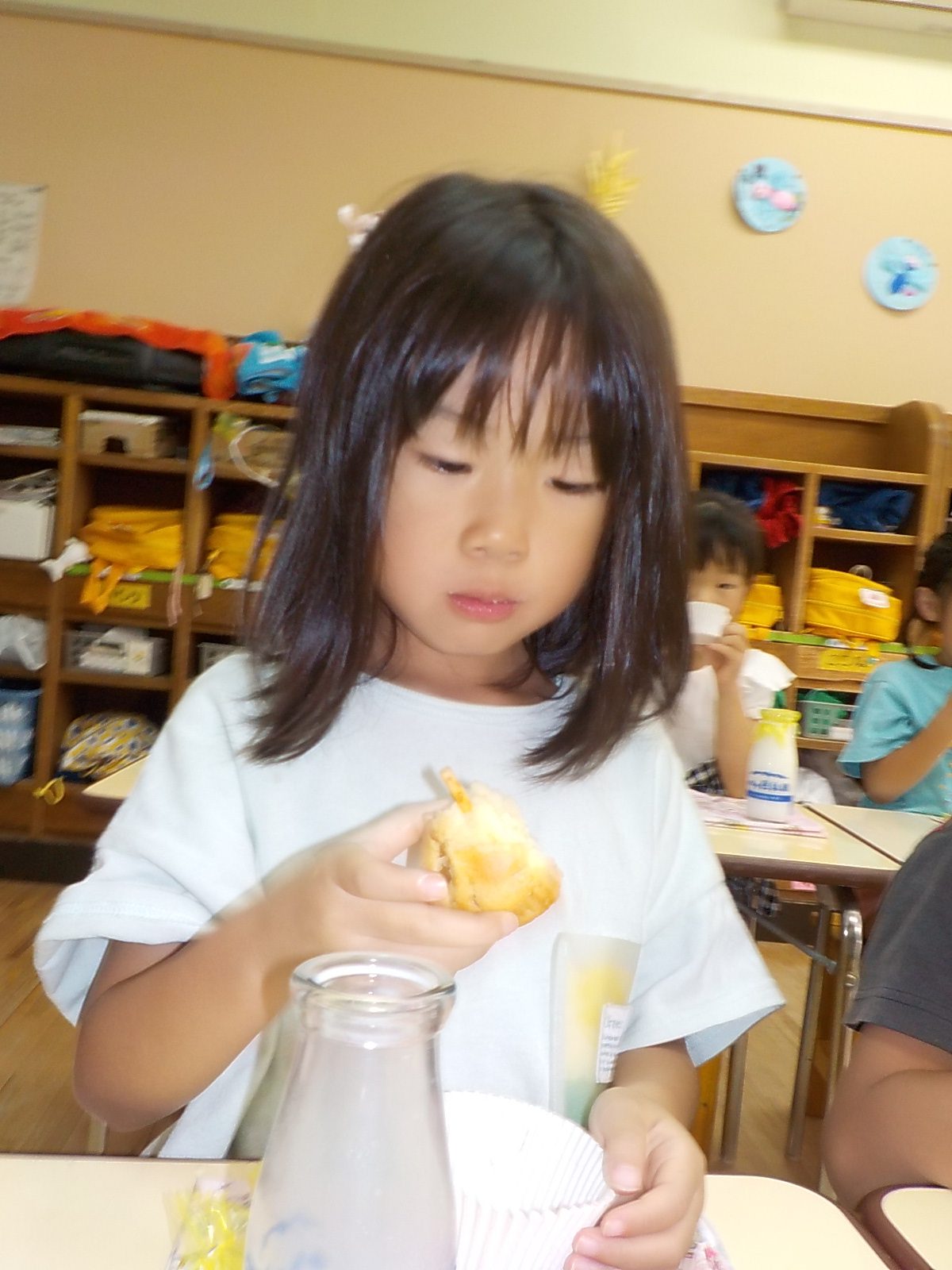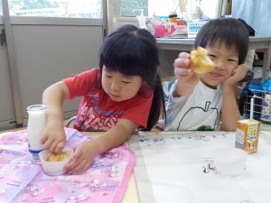 ・煮リンゴは、好き嫌いが分かれます。このマフィンも全員が「美味しい」と食べたわけではありません。しかし、絵本を見て、そのリンゴマフィンを見て、友だちの反応を見て「ちょっとなら食べてみようかな?なめてみようかな?」と、いう気持ちに変化のあったお友だちもいました。絵本から気持ちの変化に繋がる姿に、嬉しく感じました。
