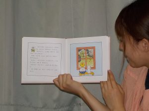 小さな絵本なので、しっかり目を向け、リンゴの木の1年のお話を聞いていました。