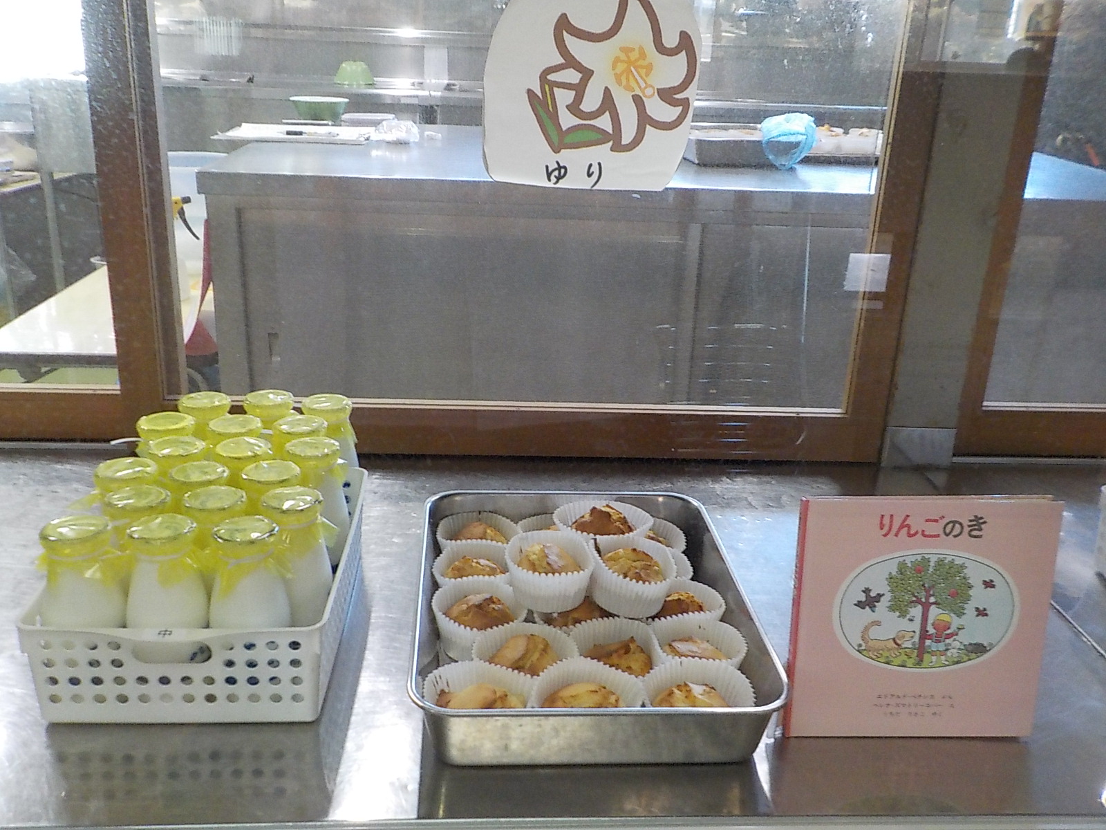 給食の献立には、いろいろなテーマをつけて献立を立ててある日があります。10月には、”絵本献立”があり、子どもたちが食す前にその食材が描かれた絵本を読み聞かせてもらい、絵本を通して食材への関心を深めたり、食べる楽しみを持ったりしてほしいと計画されました。