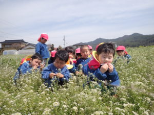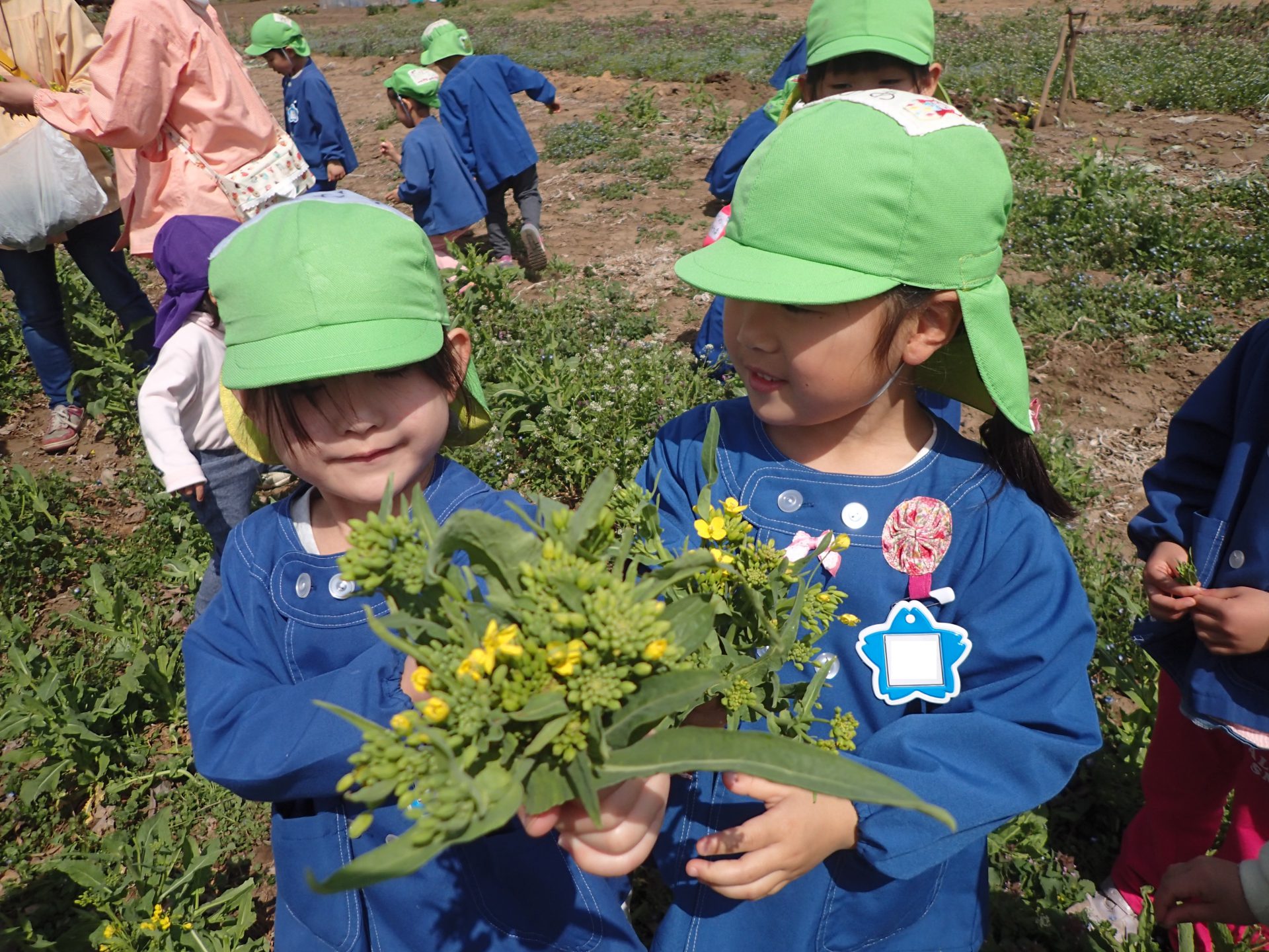 地域の方の畑でなずなや菜の花を摘んで楽しみました。