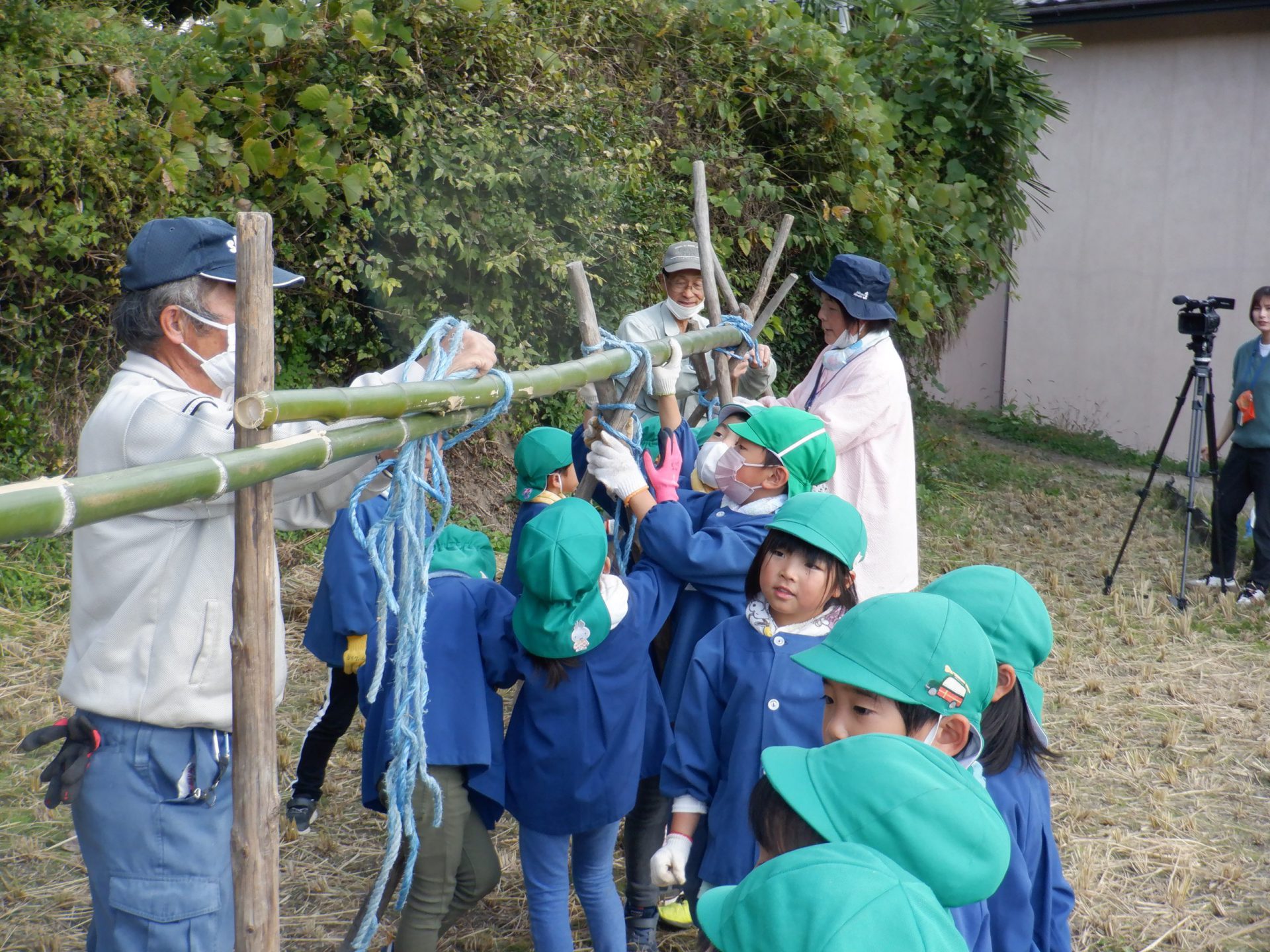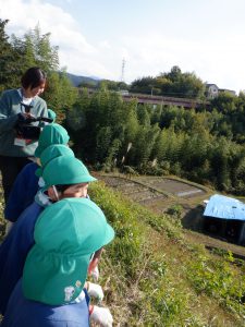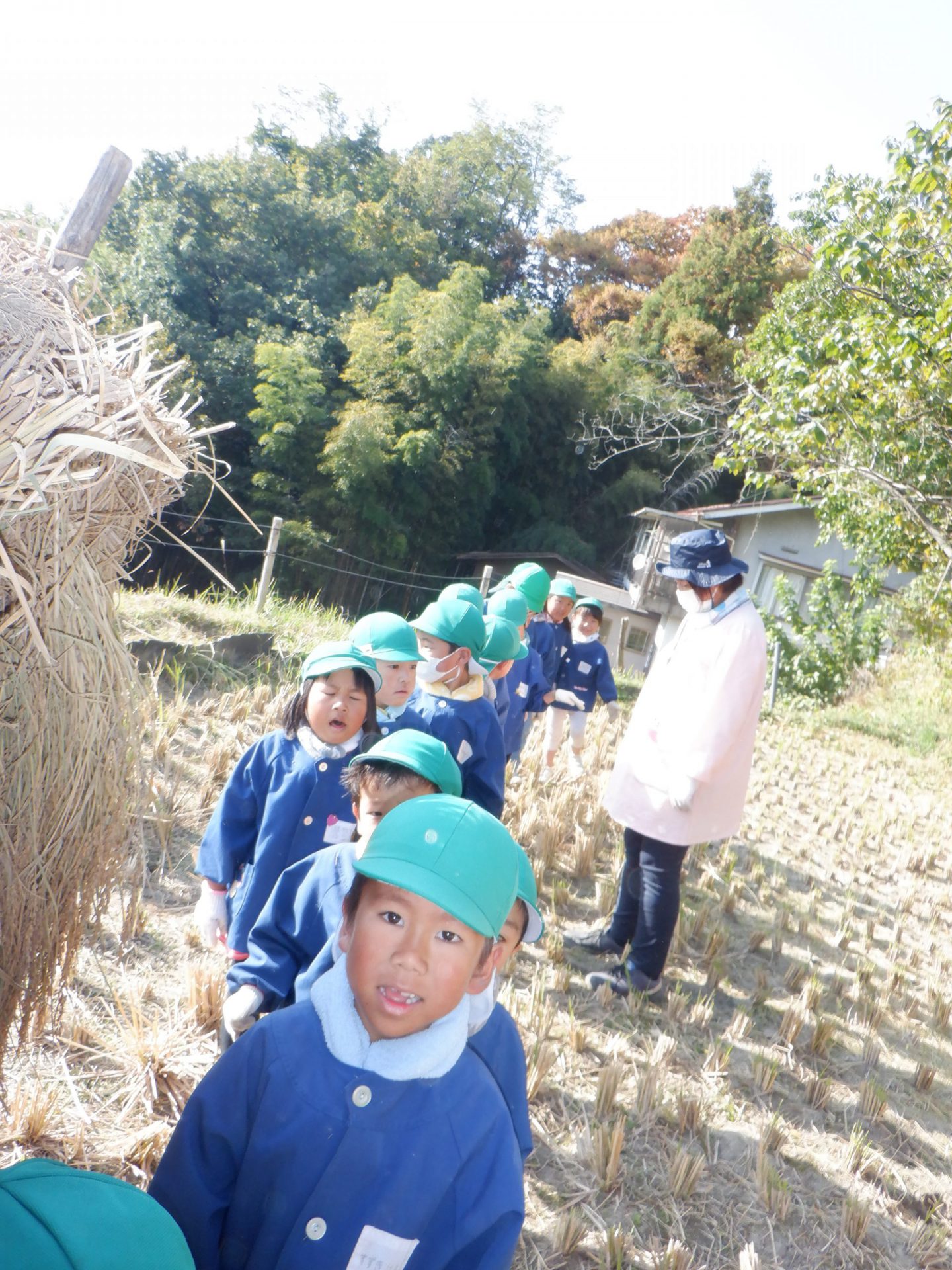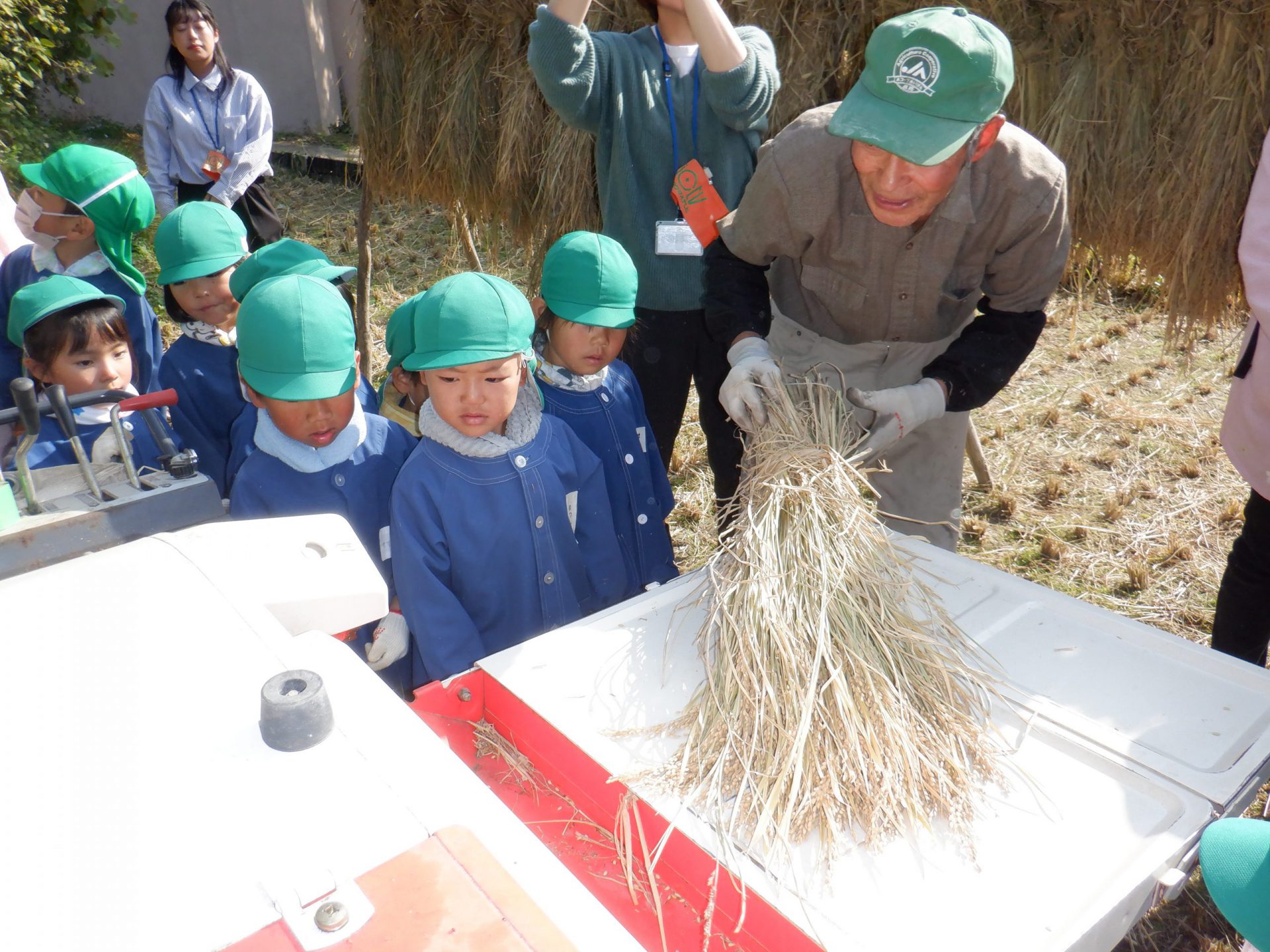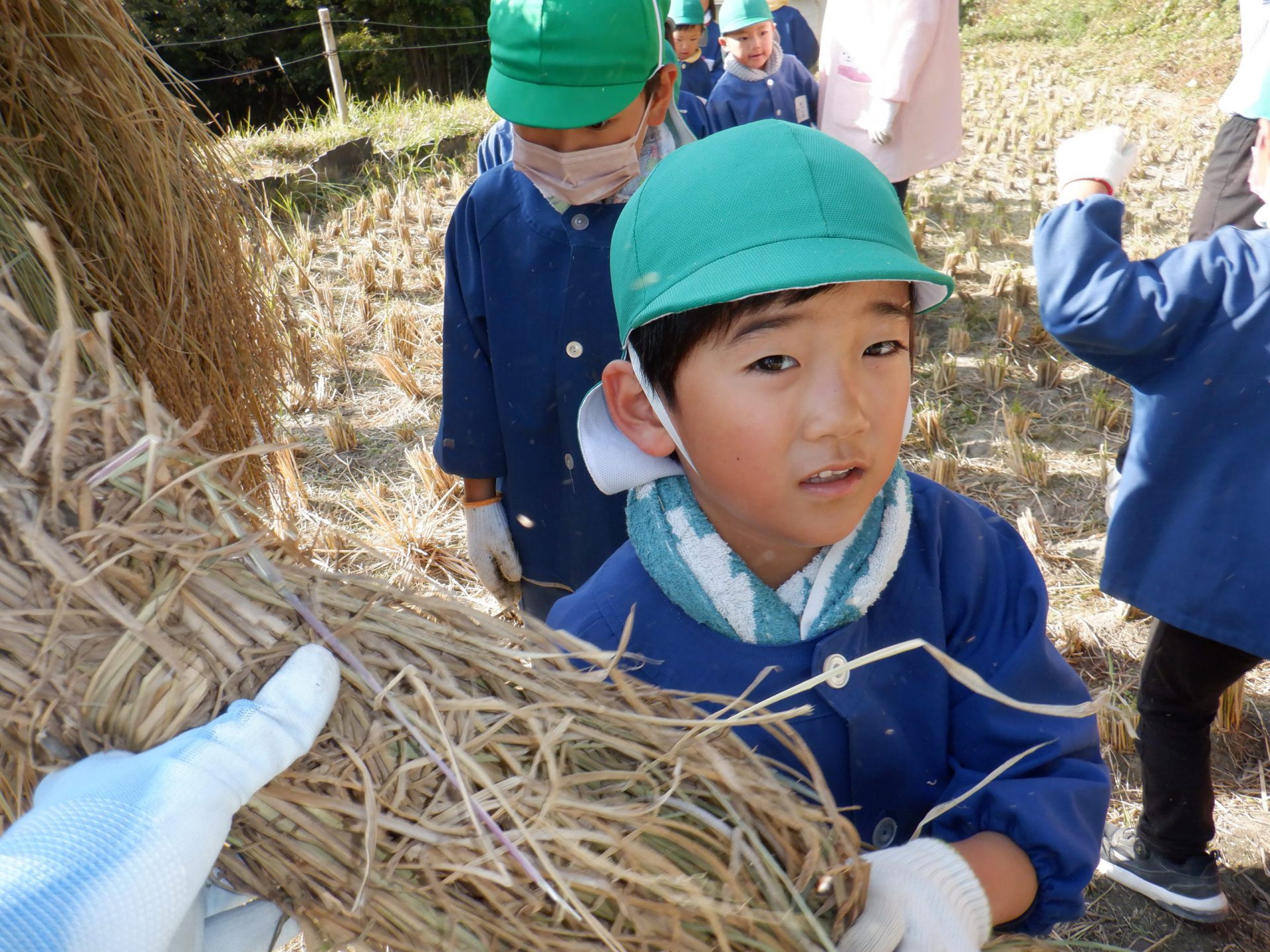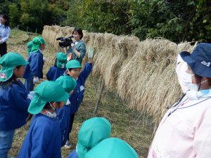 稲刈りをした稲をいよいよ脱穀です。田んぼに年長さんが張り切って出かけました。 田んぼではあぐりの熊谷さん・前澤さん・久保田さんが待っていてくれました。