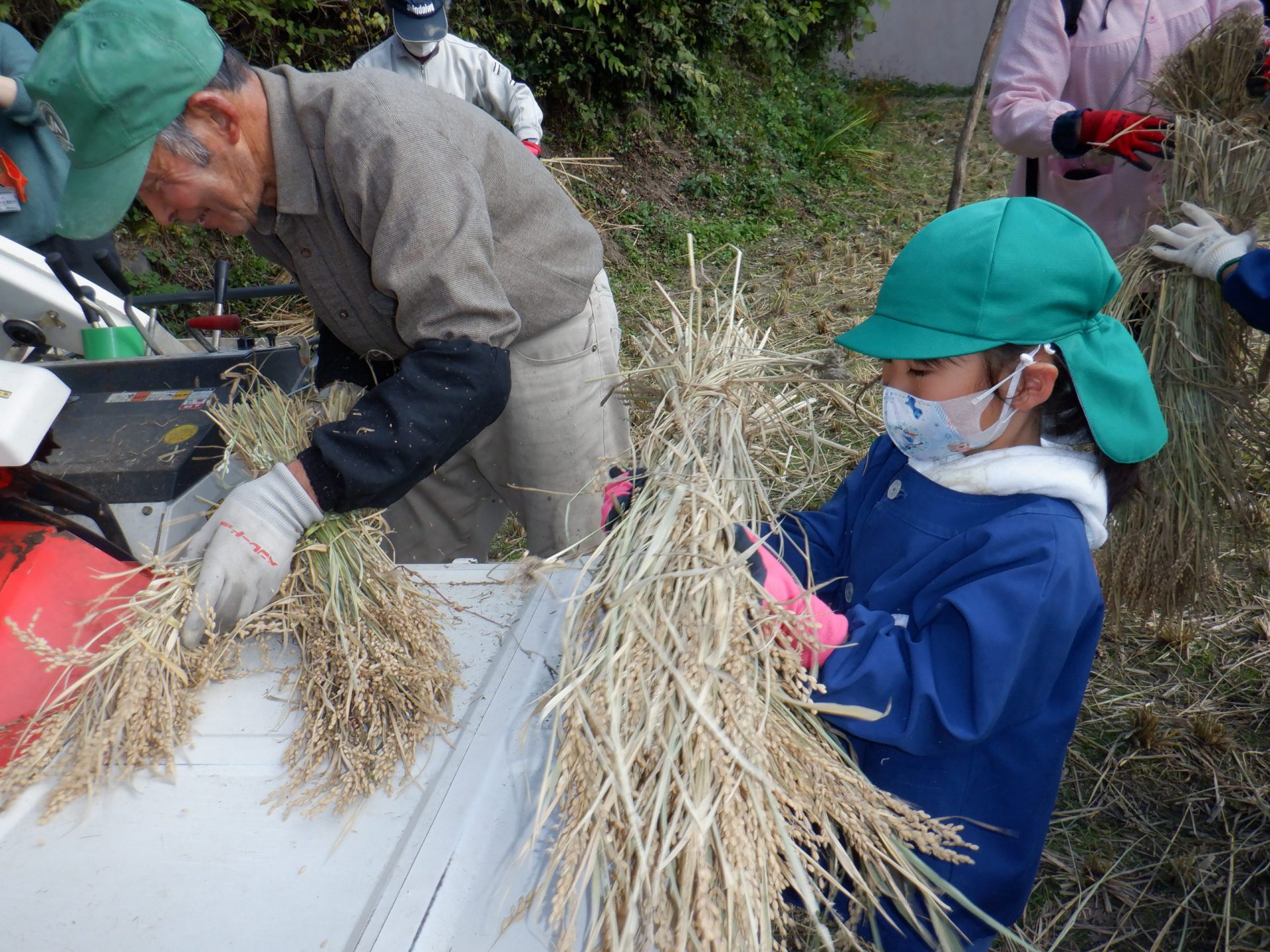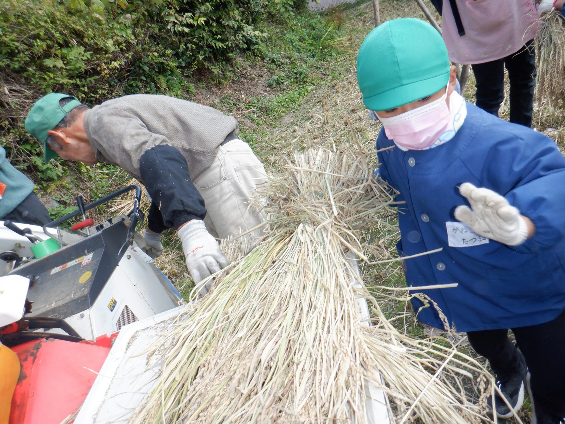 「脱穀機すごい音がする。」 「機械に入れるとお米が全部取れて藁だけになってこっちから出てくるね。」 「機械に稲が吸い込まれていくみたいでおもしろい。」 「お米が袋にどんどん貯まる。」 「皆で運んだら、すぐ終わっちゃった。」 「おにぎり温かい〜」 「いい匂いがする。」 「おいしい〜もっと食べたい。」