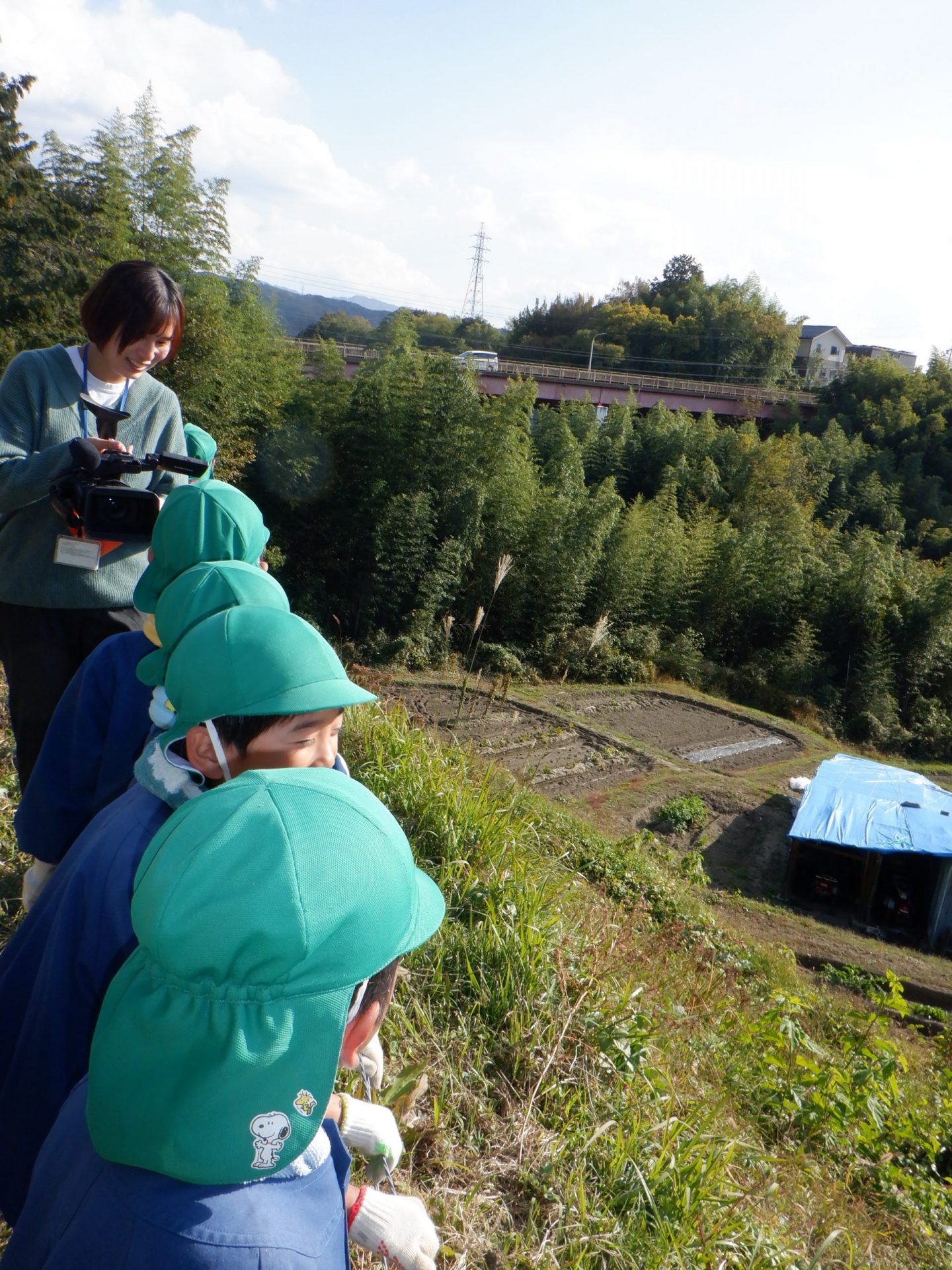 田んぼから下を覗いて、景色を見ています。