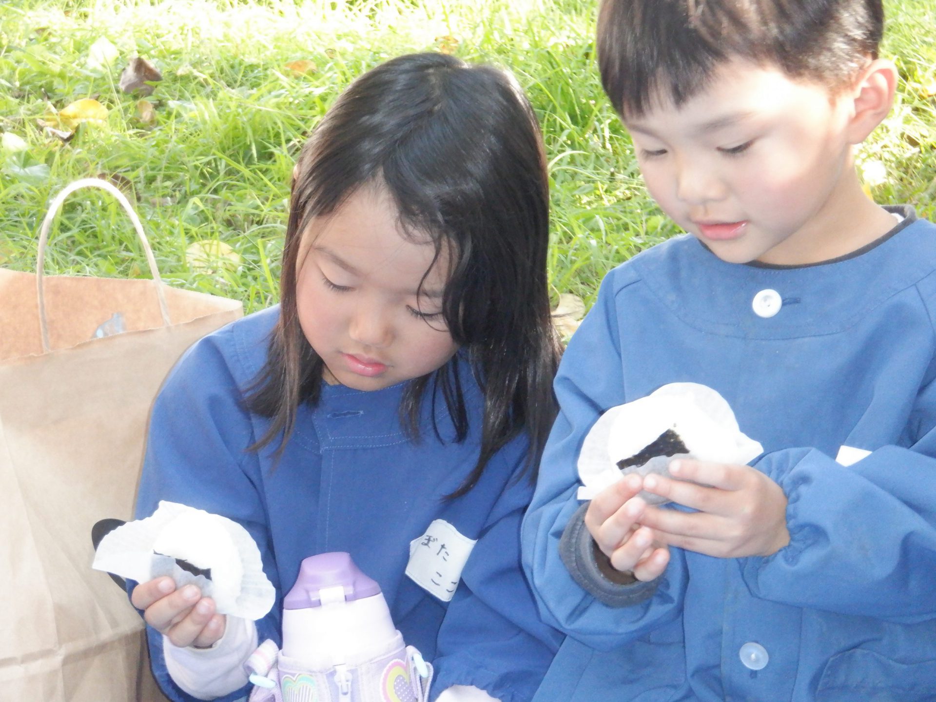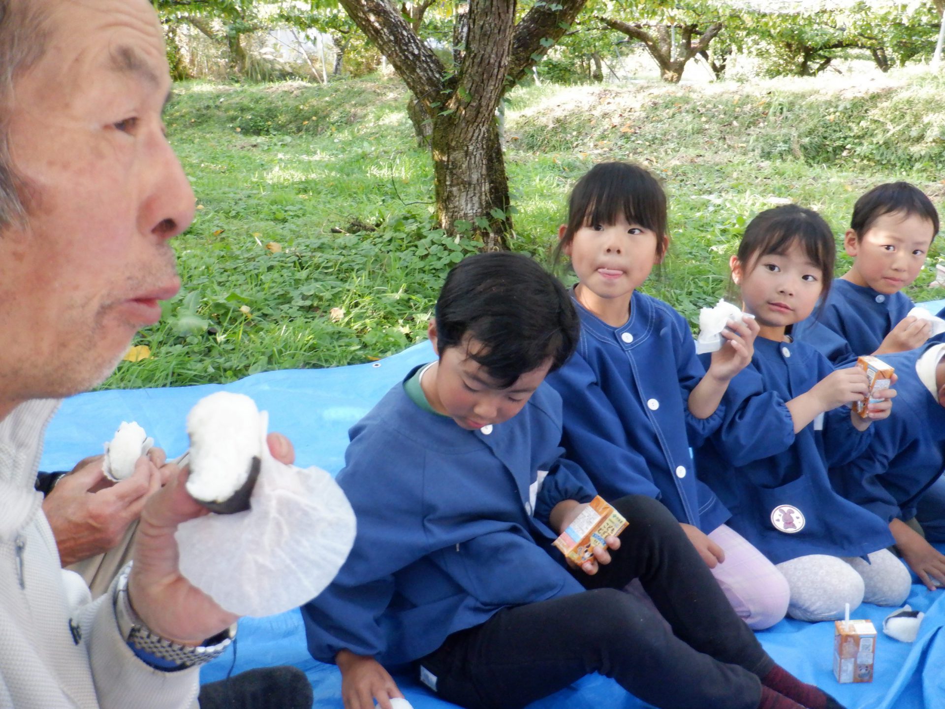 園長先生と給食先生がおにぎりを握ってくれて、おやつタイムです。