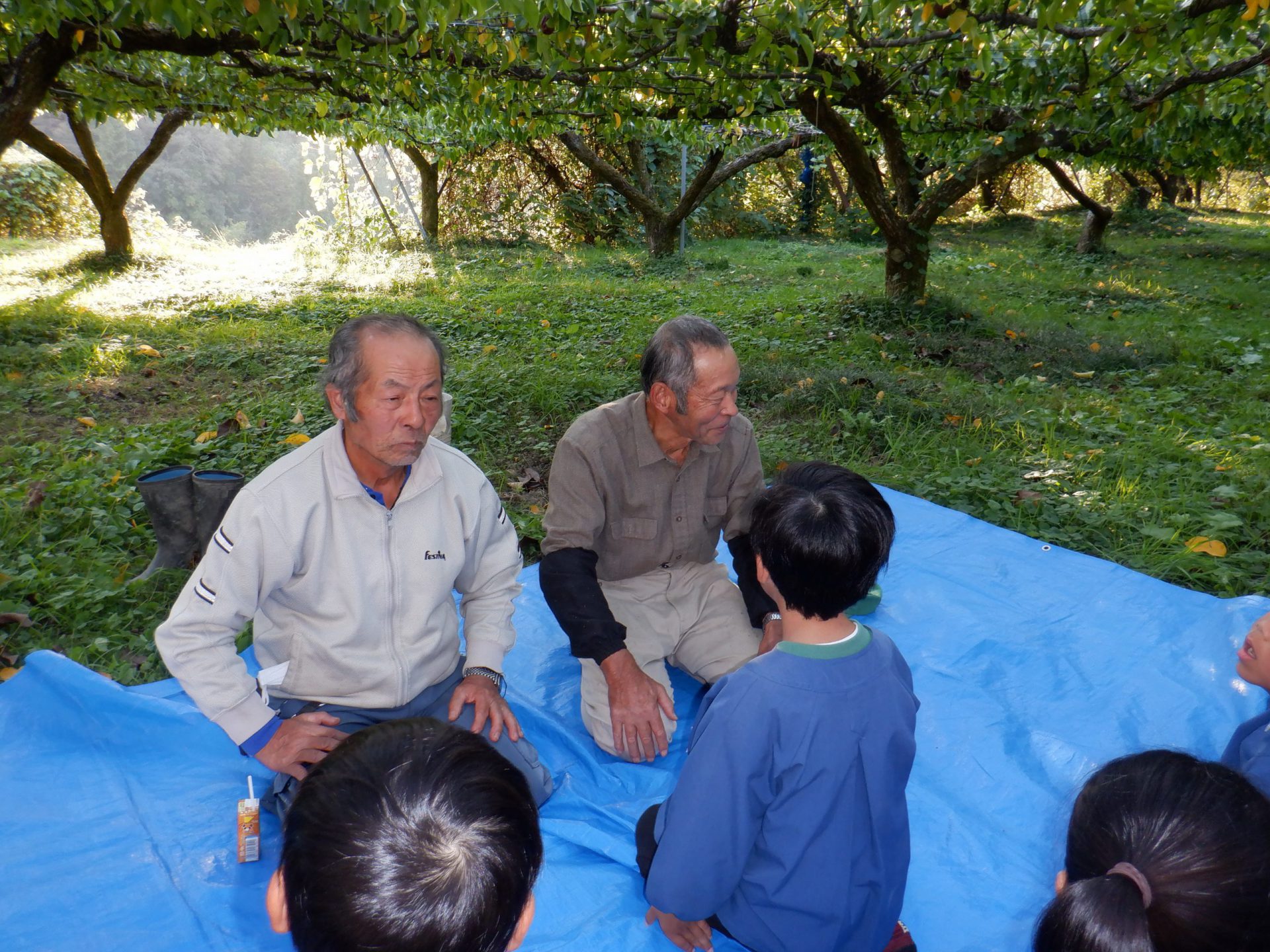 作業が終わって休憩タイム、果樹園の下に敷いたブルーシートの上でゴロゴロ。 その間に脱穀した籾を精米機にかけて・・・すぐ給食室で炊いてもらいました。