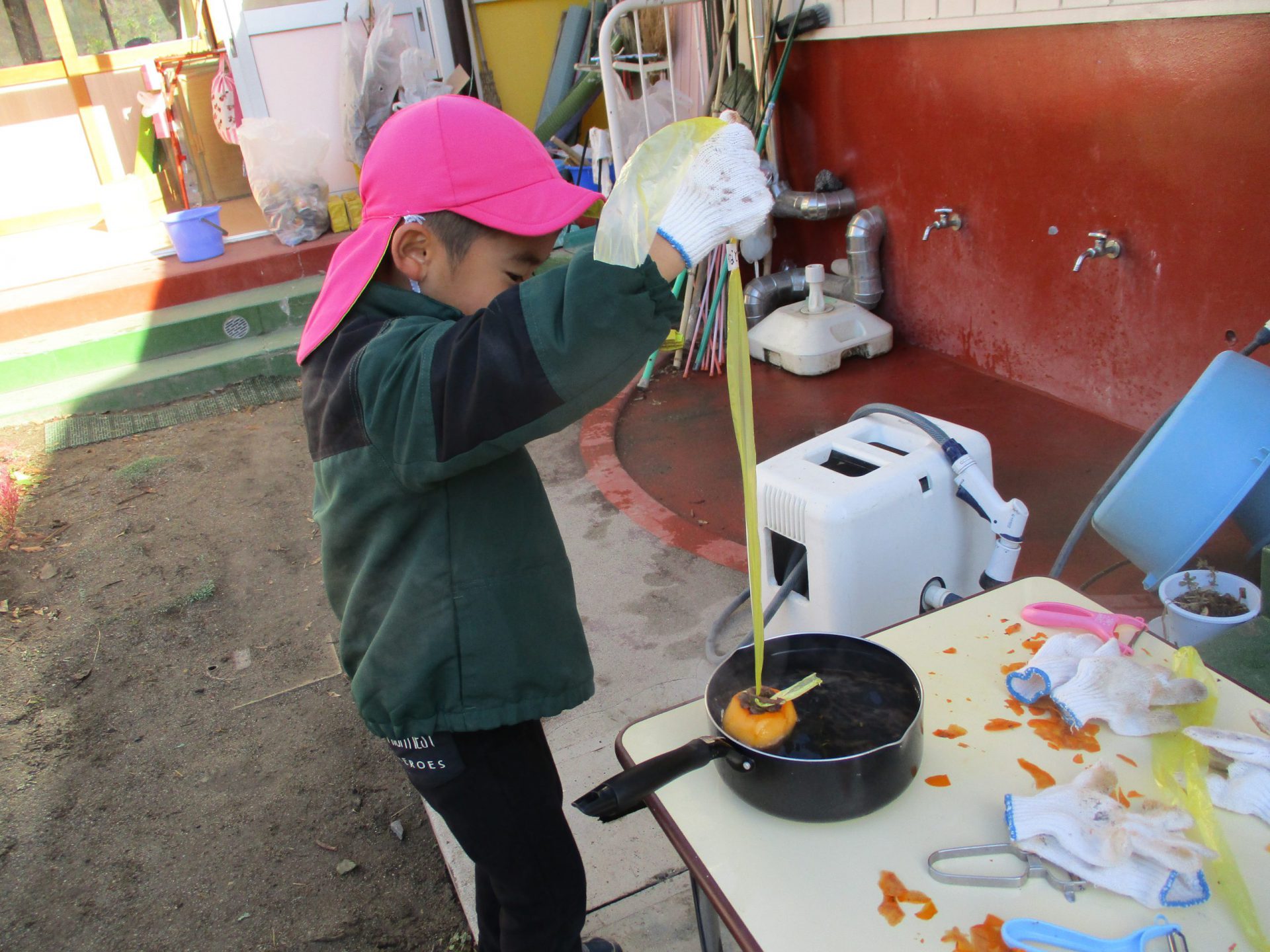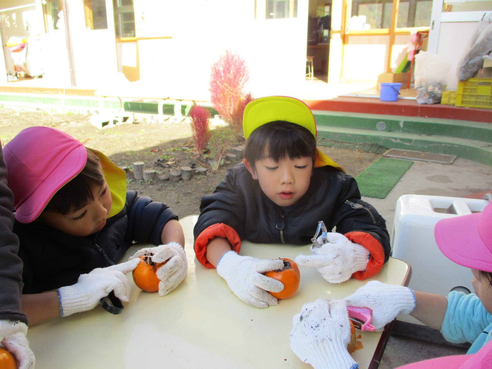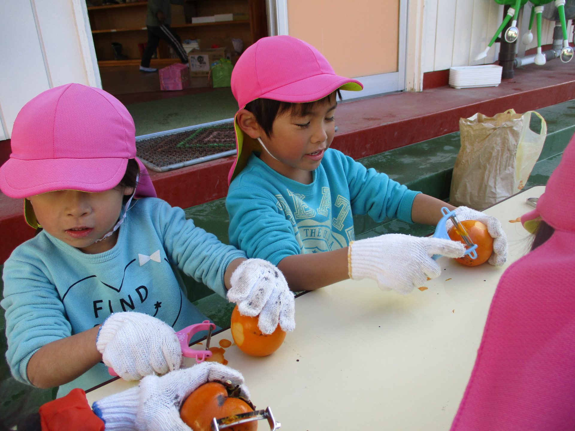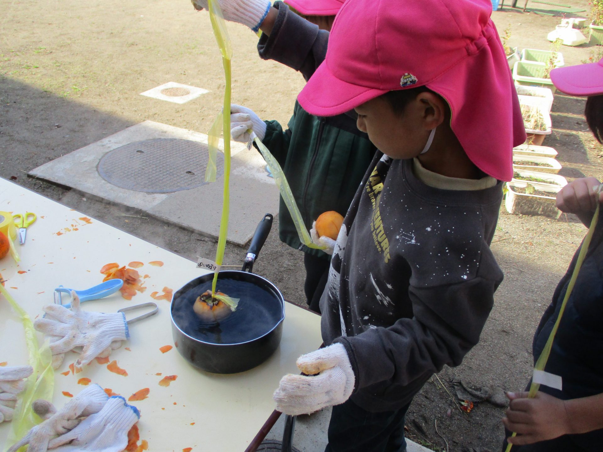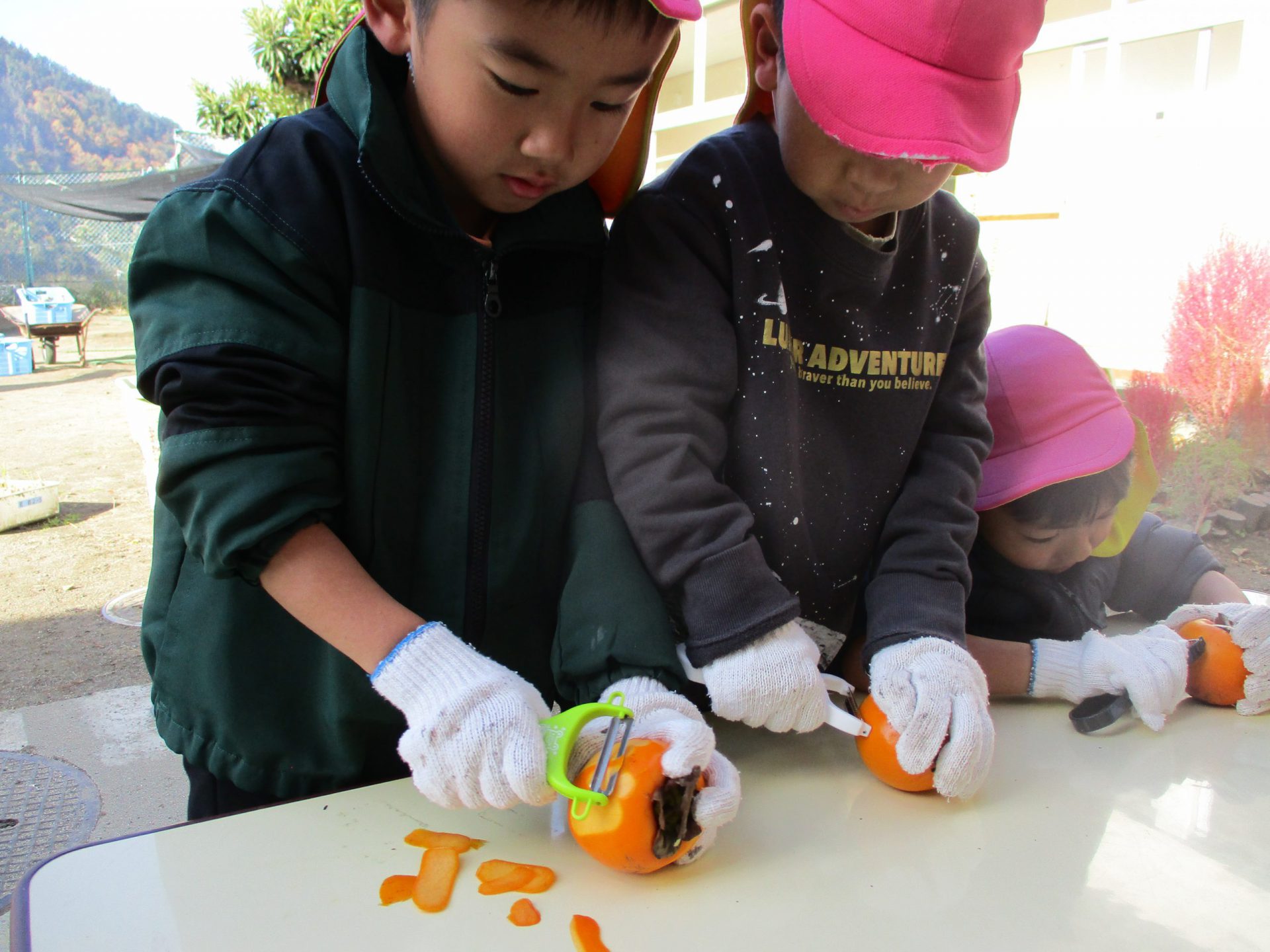 みんな軍手を装着して・・・ピーラーで皮むきをしていくよ。