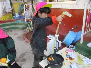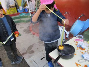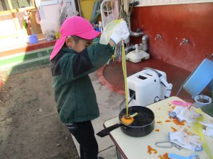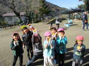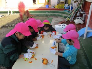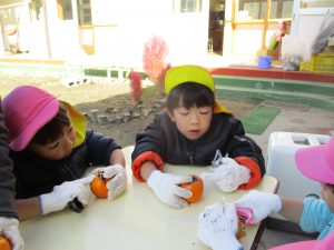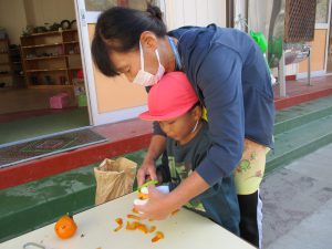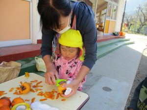 年長が皮むきを始めると、「やってみたい」と、興味津々で走ってきた未満児さん。普段から異年齢交流ができているので、何事にも興味関心が高まっている。こんな姿を見らた時に、できない。ではなくできるを形にできるところが、この園のよいところなのだと改めて感じた。