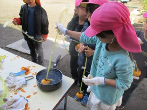 柿が不作で諦めていた干し柿作りでしたが、いつも頂く東の親分からもらえることになり、今年も子ども達に干し柿作りを経験させてあげることができありがたい。