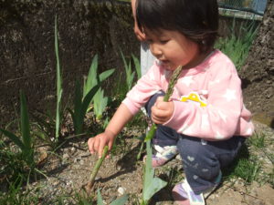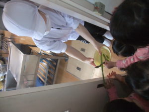 ・庭先に生えてきたアスパラガスを子どもたちが収穫し、給食室へ届けて調理してもらう