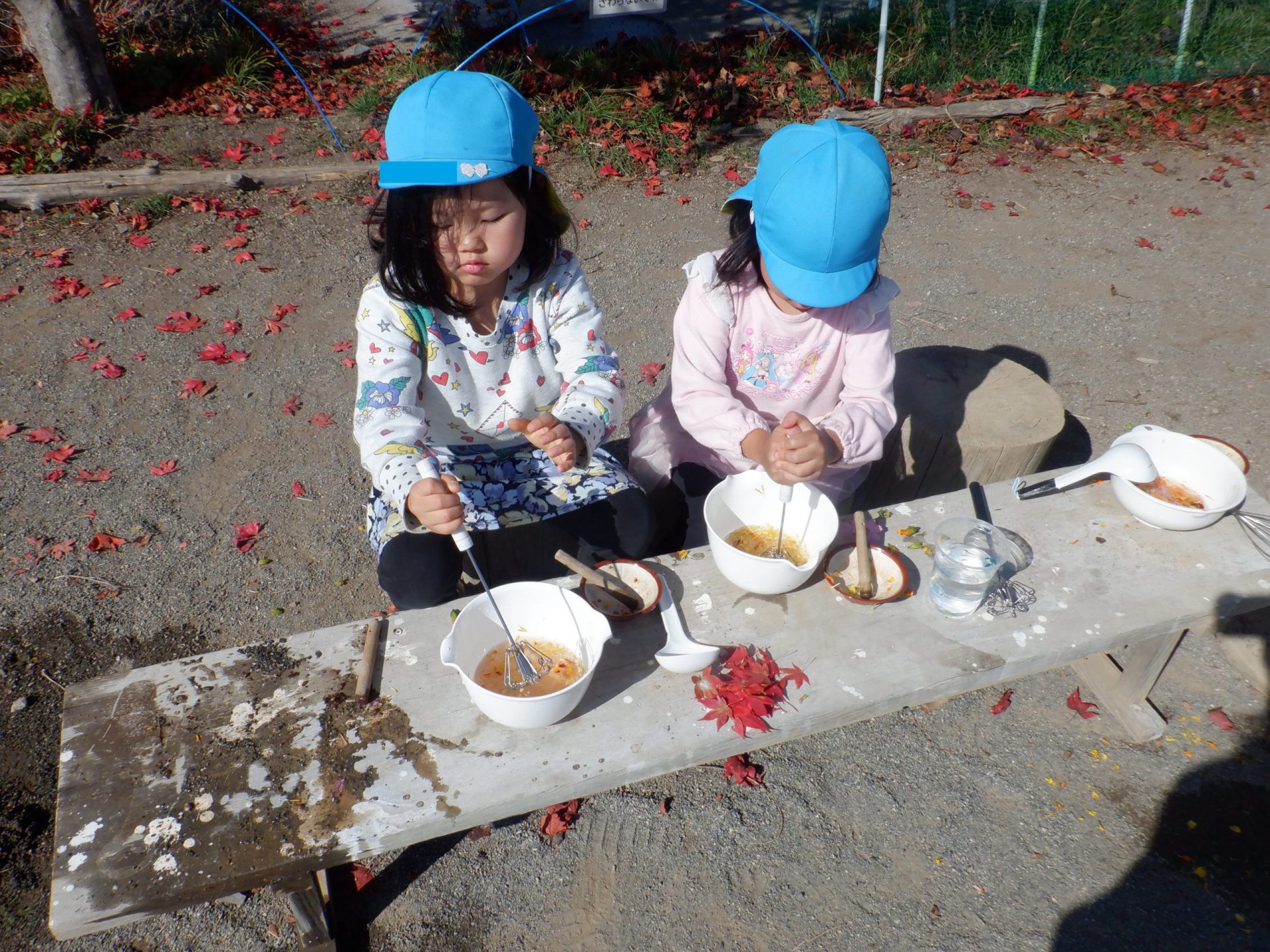 楽しく遊んでいる中、南部さんとの交流が「はずかしい……」という子もいました。保育士を仲立ちとなり、「どの花を採っていいの?」と尋ねたりしながら、一緒に色水作りを楽しみました。帰ってからも「ドキドキした~!」と言っていながらも、どこか満足気な様子でした。