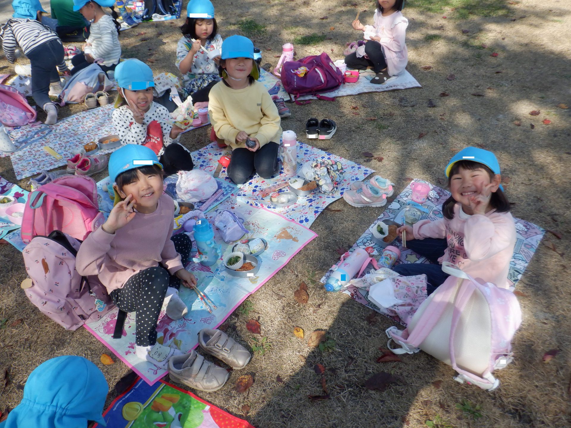 楽しい時間はあっという間、お昼の時間になりました。今日のメニューは、お家の人が握ってくれたおにぎりと、園長先生が届けてくれたチキンカツ、キュウリの浅漬け、ミニゼリーです!しっかり遊べたのか、皆いつもより気持ちのいい食べっぷりでした。