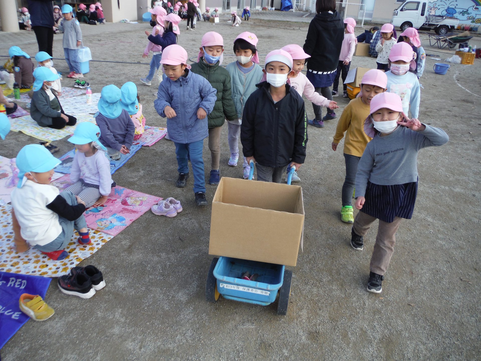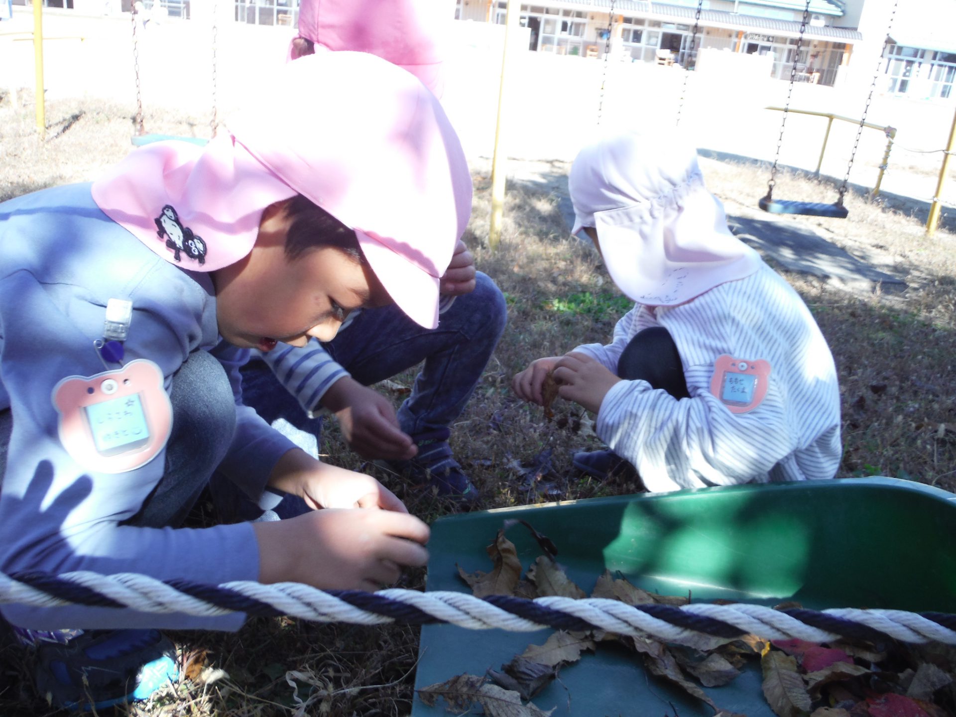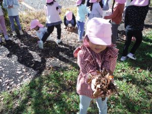 さて、このお芋をどうしようか?とみんなで考えましたが、「食べたい!!」が一番多く、やきいも会に向けて準備を進めることになりました。やきいも会には何が必要かな??との相談に「木・葉っぱ・火・アルミホイル・新聞!!」と色々意見が出てきました。最後に出てきたのは「おとな!!」火を使うために大人の手が必要だと考えたのでした。お家で薪を集めてきたり、園庭の周りの落ち葉を友達と協力しあって集めました。更にやきいも会への期待が高まりました。