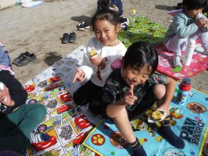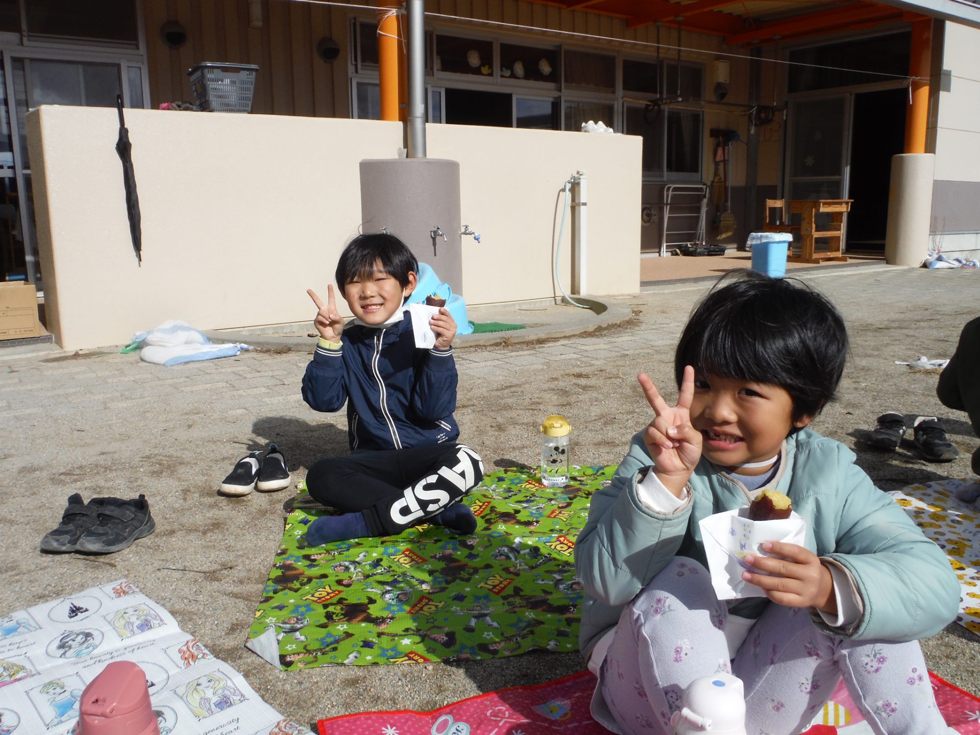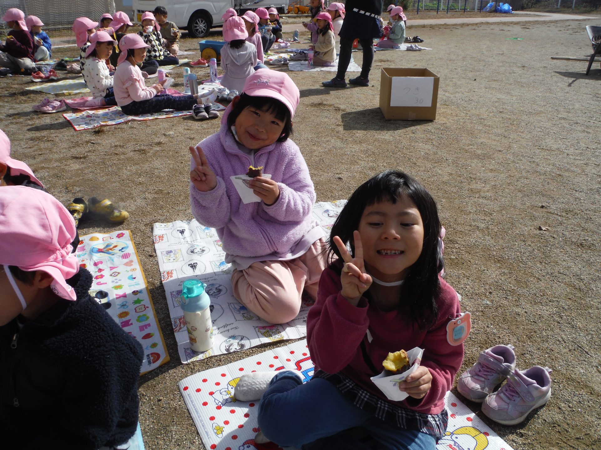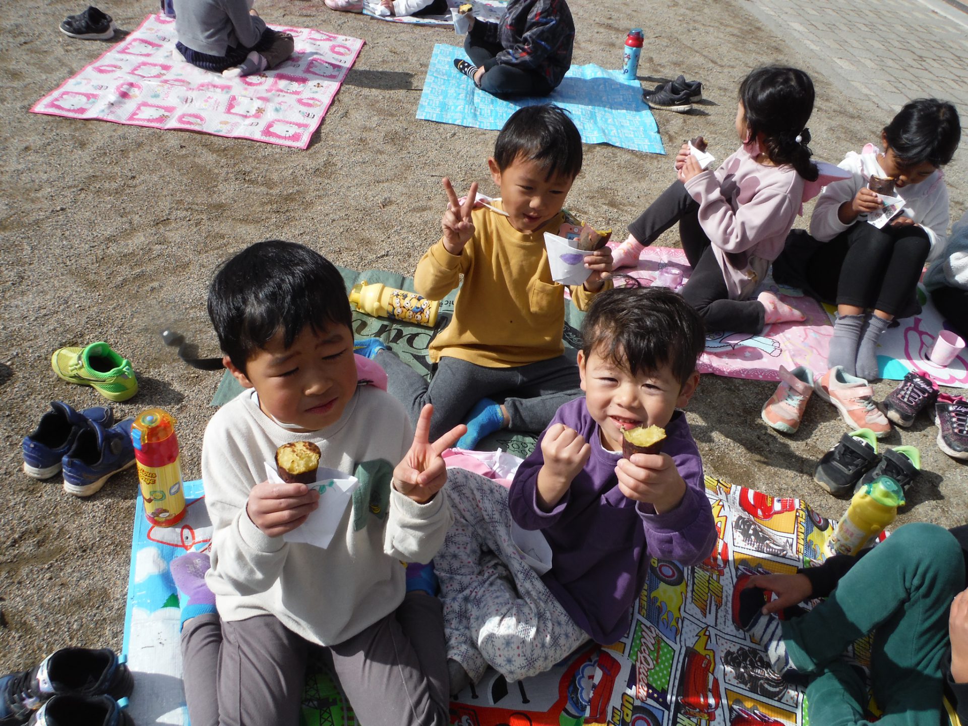 やっと自分たちの手元にやきいもがくると、甘いお芋に笑顔いっぱい!!おいしいと言ってあっという間に食べていました。