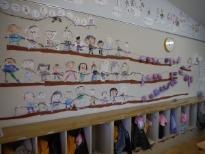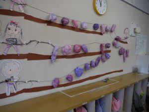 今、クラスの壁面はさつまいも掘りをしている30人の子どもたちの楽しい姿が表現されています。