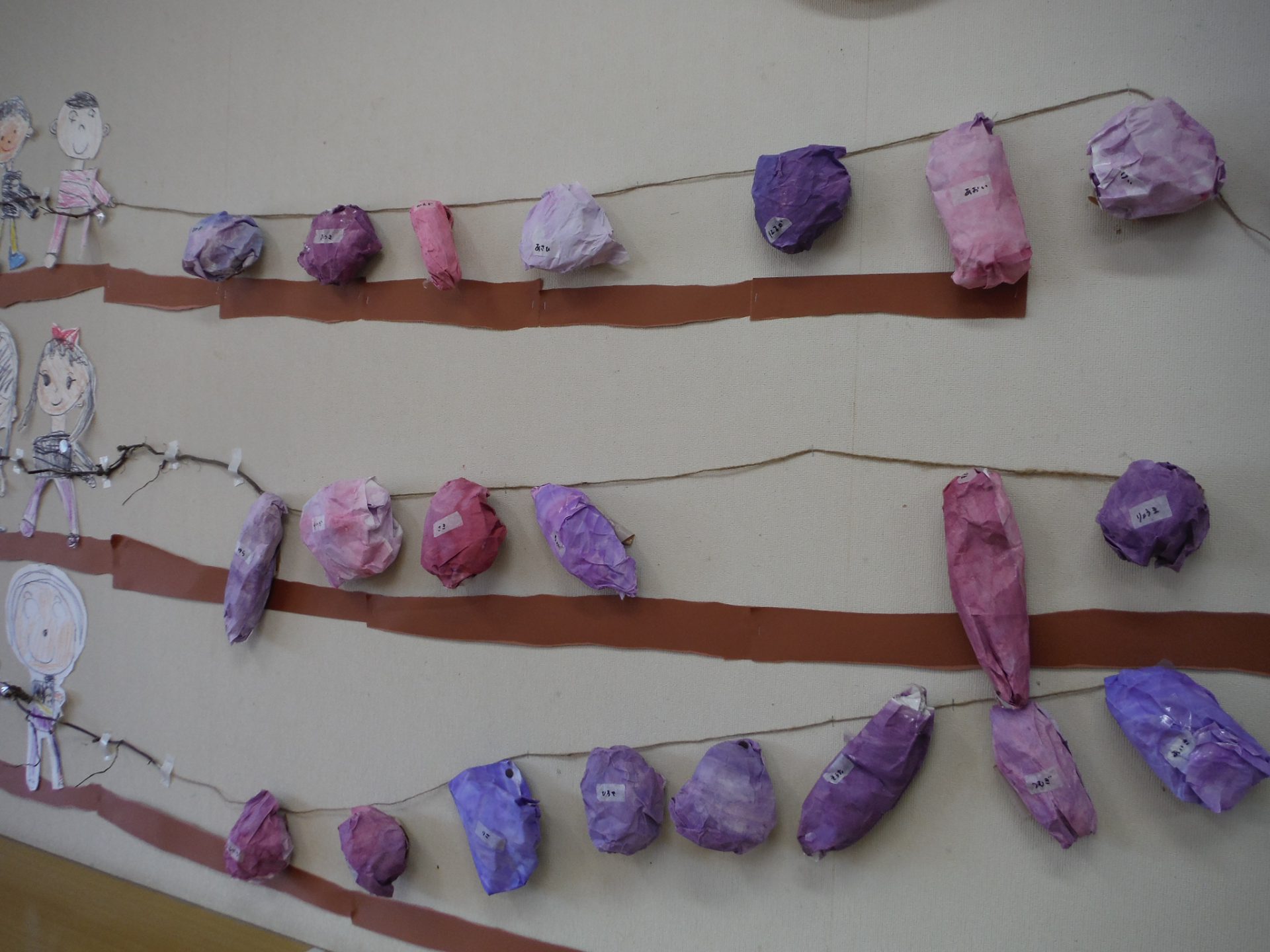 新聞紙を使ってさつまいもを立体で作りました。さつまいもの色は絵の具を混ぜて作り、塗りました。世界に一色だけの紫色ができました。この活動でも、「赤と青を混ぜよう」「ピンクと水色を混ぜよう」「赤を多めで青を混ぜよう」と友達と相談し合って色作りを楽しみました。