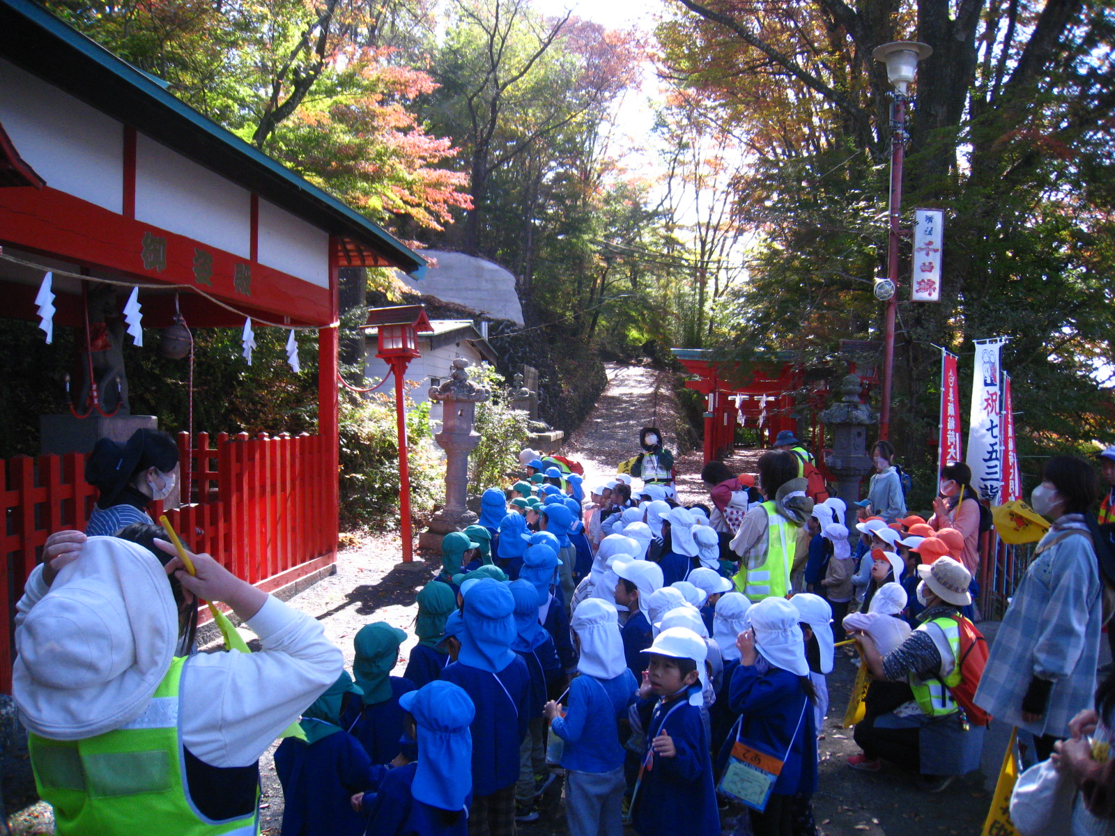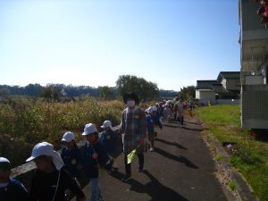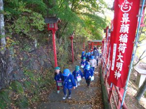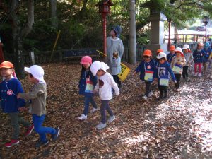秋も深まり、園の周りの木々も色づいてきました。そこで、以上児クラスで鼻顔稲荷公園へ仲良し散歩へ行ってきました。年少児・年長児ペアと、年中児も隣のクラスの友達と手をつなぎ、出発!!